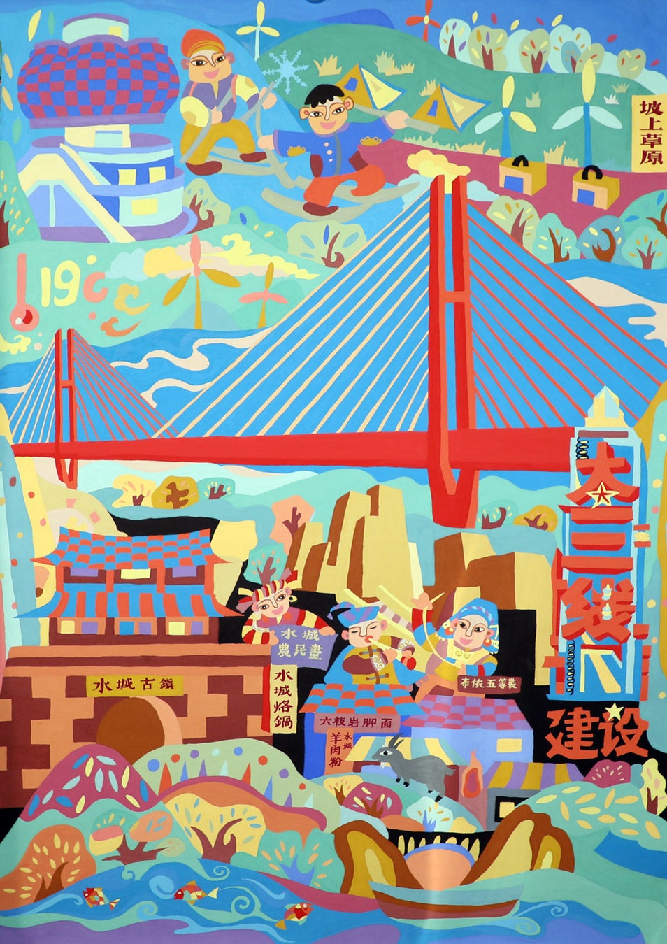 中国貴州省水城の画家たちが描いた民間芸術「水城絵画」は、鮮やかな色使いと素朴なタッチで、人物や動物が愛らしく描かれています。色とりどりの絵の中には、楽しそうな生活の様子、喜びにあふれる作物の収穫、お祝いの準備をする家庭の様子など、日常の風景が季節感・生活感豊かに表現されています。水城絵画は中国の芸術文化であり、現代アートの一つのジャンルとしても、世界中から関心を集めています。