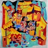 水城絵画は「好きなものを好きなように描けばそれでよし!」というのが大きな特徴です。その独特な色使いや素朴なタッチが、多くの人を魅了しています。また、装飾的な要素が多く、純色を並べて対比させたり、変形や誇張、象徴的な表現を中心にしたり、一般的な画法である色調の統一や調和は重視されません。人物の色合いや表情も作家ごとに異なっており、見る人の心を和ませ、ほっこりとした楽しい気分になること間違いなしです。