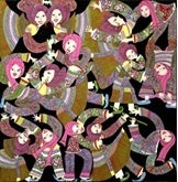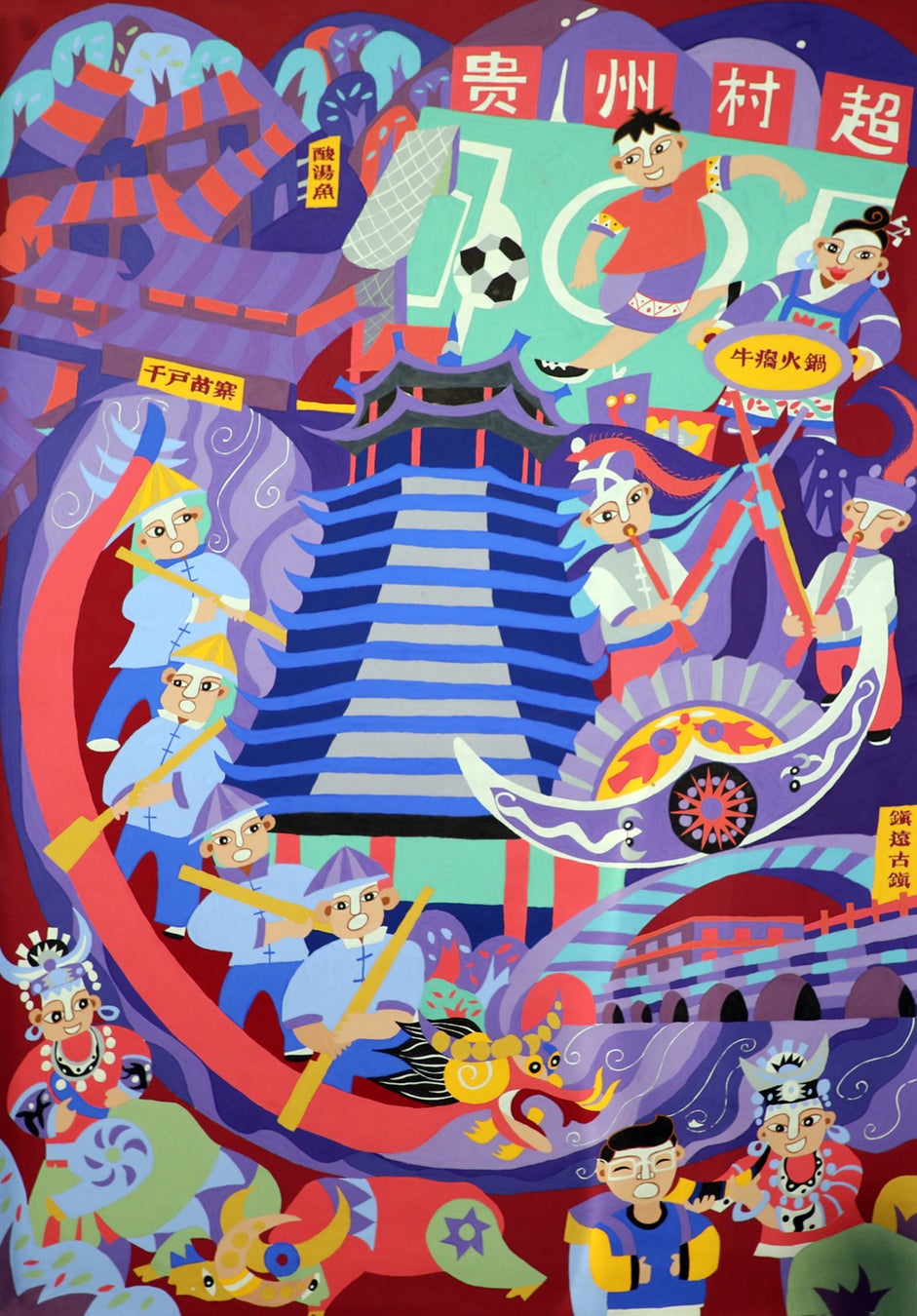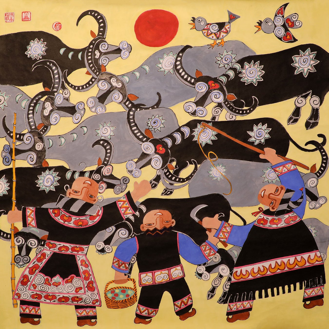 ミャオ族に伝わる祭りの光景を鮮やかな色彩で印象的に描いています