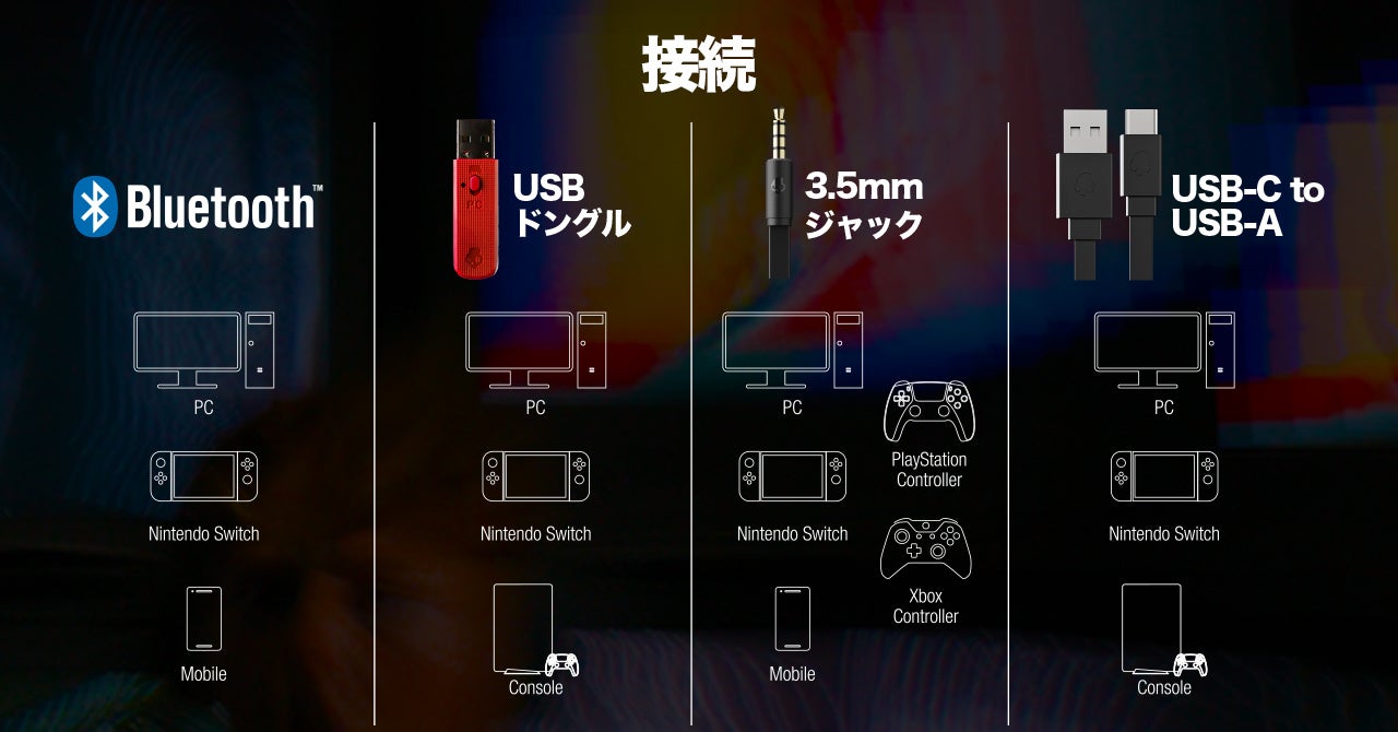 PC、Nintendo Switch™、PlayStation™、Xbox、モバイルデバイスにも接続可能です。これらのデバイスには、ドングル(2.4GHz)、Bluetooth®5.3、USB-C、3.5mmAUXケーブルを使って接続でき、ゲームの種類や用途に応じて使用することができます。