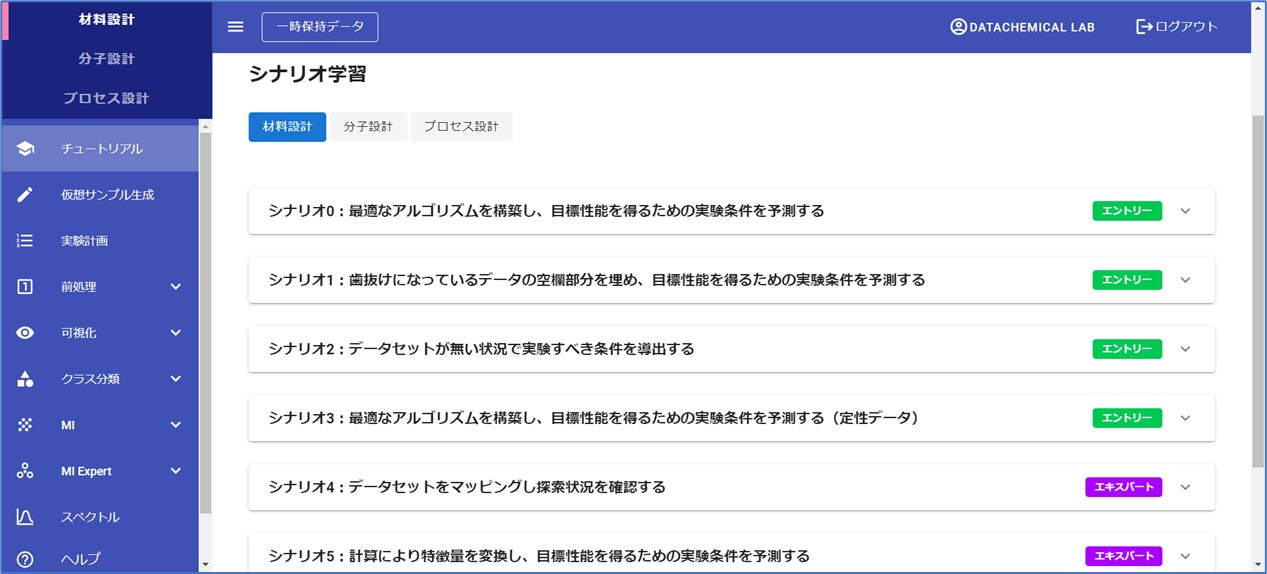 「Datachemical LAB」は、プログラミング不要で直感的に操作できるだけでなく、豊富なユーザーサポート機能により、データサイエンス初学者でも自身でAI・機械学習による解析手法を学びながら実践できるようになっております。