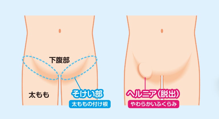 鼠径ヘルニア(脱腸)は、お腹の壁に穴が開き、太ももの付け根あたりに腸の一部が飛び出してくる病気です。