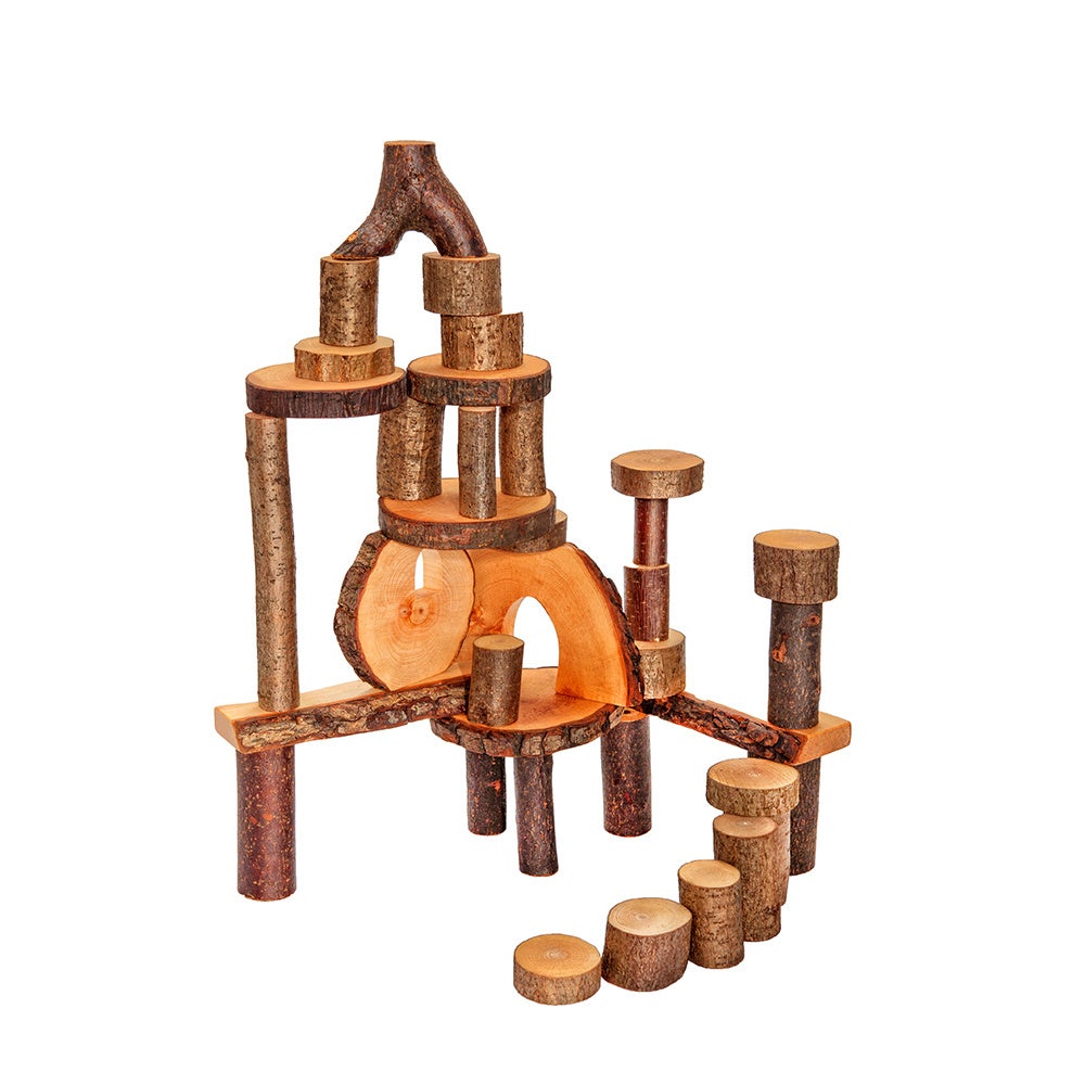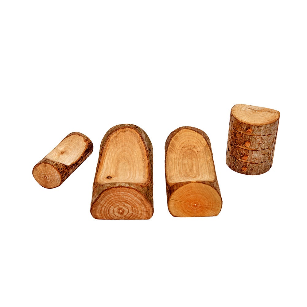 形は樹木の個性を活かし、高さを2㎝、4㎝、6㎝、8㎝、10㎝の5種類で揃えてあるブロックが36個入っています。 積み重ねたり並べたりすることで、数や計算、バランス感覚など、 創造と想像の可能性を広げられます。