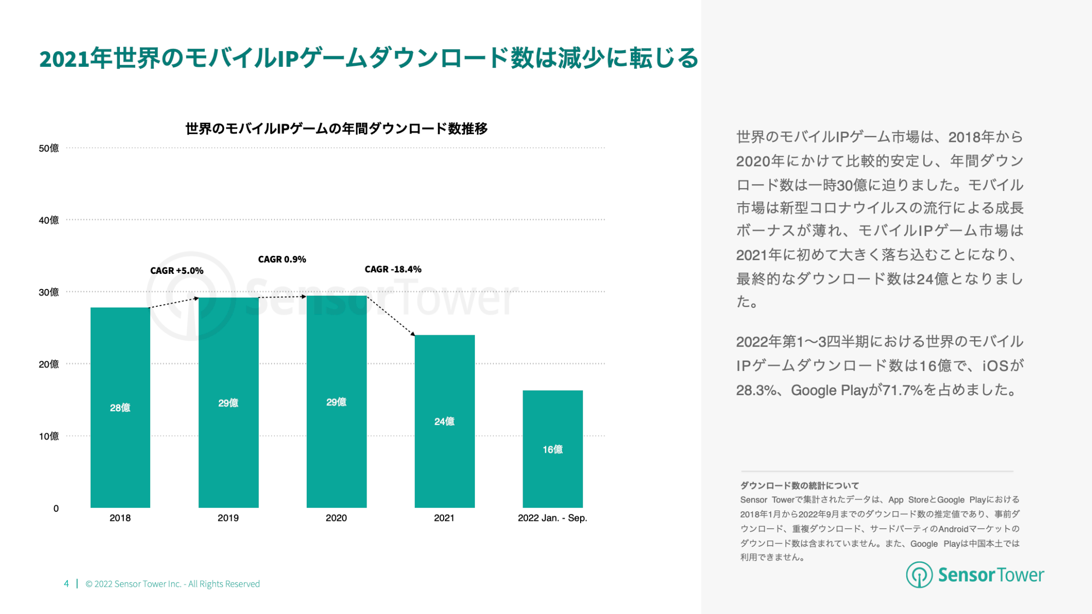 2022年第1~3四半期における世界のモバイルIPゲームダウンロード数は16億で、iOSが28.3%、Google Playが71.7%を占めました。