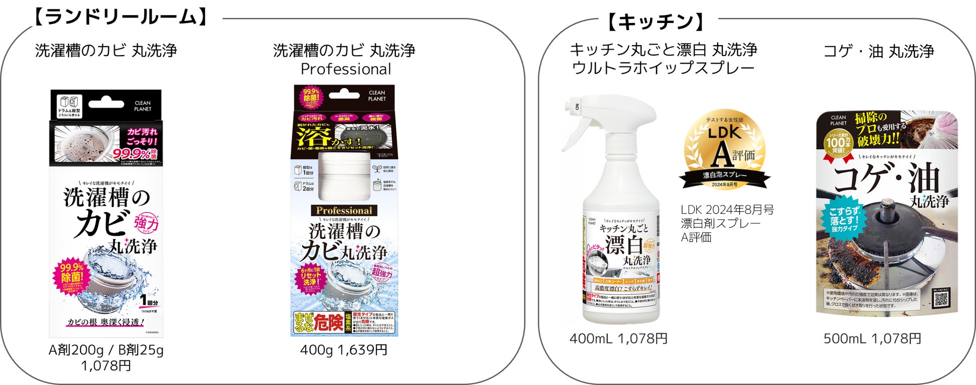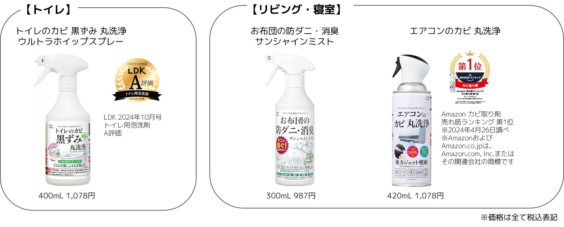 シンクやキッチン周りのヌメリ・黒ずみを濃密泡でピカピカにする「キッチン丸ごと漂白 丸洗浄 ウルトラホイップスプレー」は、「LDK(2024年11月号)」にて、「漂白剤スプレー A評価」を受賞。その他、同シリーズの「トイレのカビ黒ずみ 丸洗浄 ウルトラホイップスプレー」は「LDK(2024年10月号)」にて、「トイレ用泡洗剤 A評価」、「お風呂場のカビ 丸洗浄 ウルトラホイップスプレー」では「MONOQLO the BEST 2024-25 カビ取りスプレーベストバイ」や「LDK(2023年9月号)」をはじめとする様々なモノ雑誌にて高評価をいただいております。