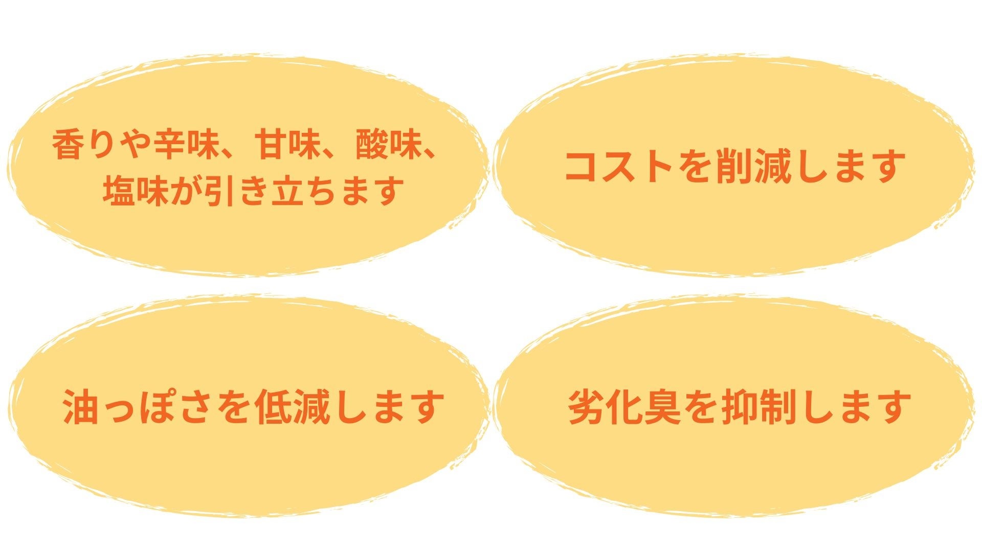 素材本来のおいしさを引き立てる食用油脂で、減塩効果やコスト削減に加えて、おいしさを感じられる期間の延長にも効果がある点が評価されました。