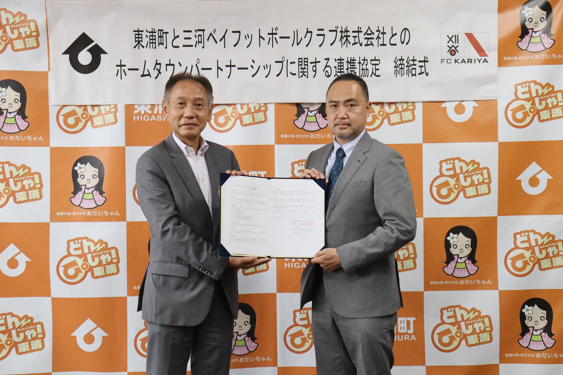 三河ベイフットボールクラブ株式会社では9/29(木)に行われたホームタウン連携協定締結式にて『東浦町』とホームタウンパートナーの締結をいたしましたのでお知らせいたします。