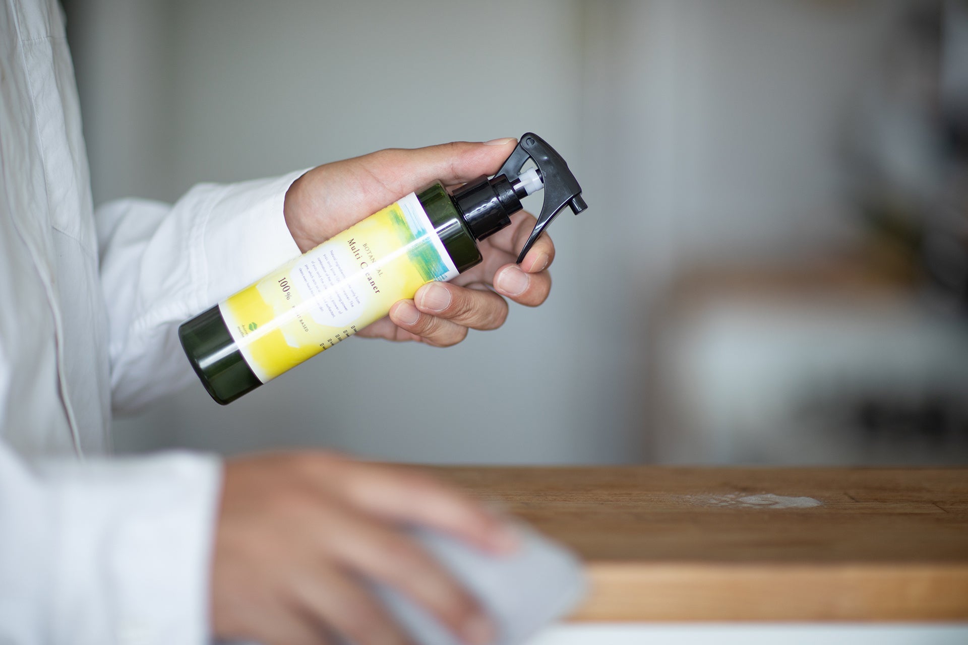 当社の「ボタニカルマルチクリーナー」は、伝統的な里山資源「実生ゆず」の研究・活用に取り組む大阪のブランド「ゆらぎスタイル(運営元:有限会社 re・make)」とのコラボレーションから生まれました。「実生ゆず」とは、ひと粒のタネから発芽して成長した木から採れる果実のことで、一般的な接ぎ木で栽培されたゆずに比べて大ぶりで香りも強いのが特長。産地では長らく、果汁を搾った後の果皮は廃棄されていましたが、近年の研究でこの果皮から抽出したエキスに、すぐれた除菌効果があることが明らかになっています。その果皮エキスに、松から抽出した自然の界面活性剤「トール油」を配合して生まれたのがこの「ボタニカルマルチクリーナー」です。