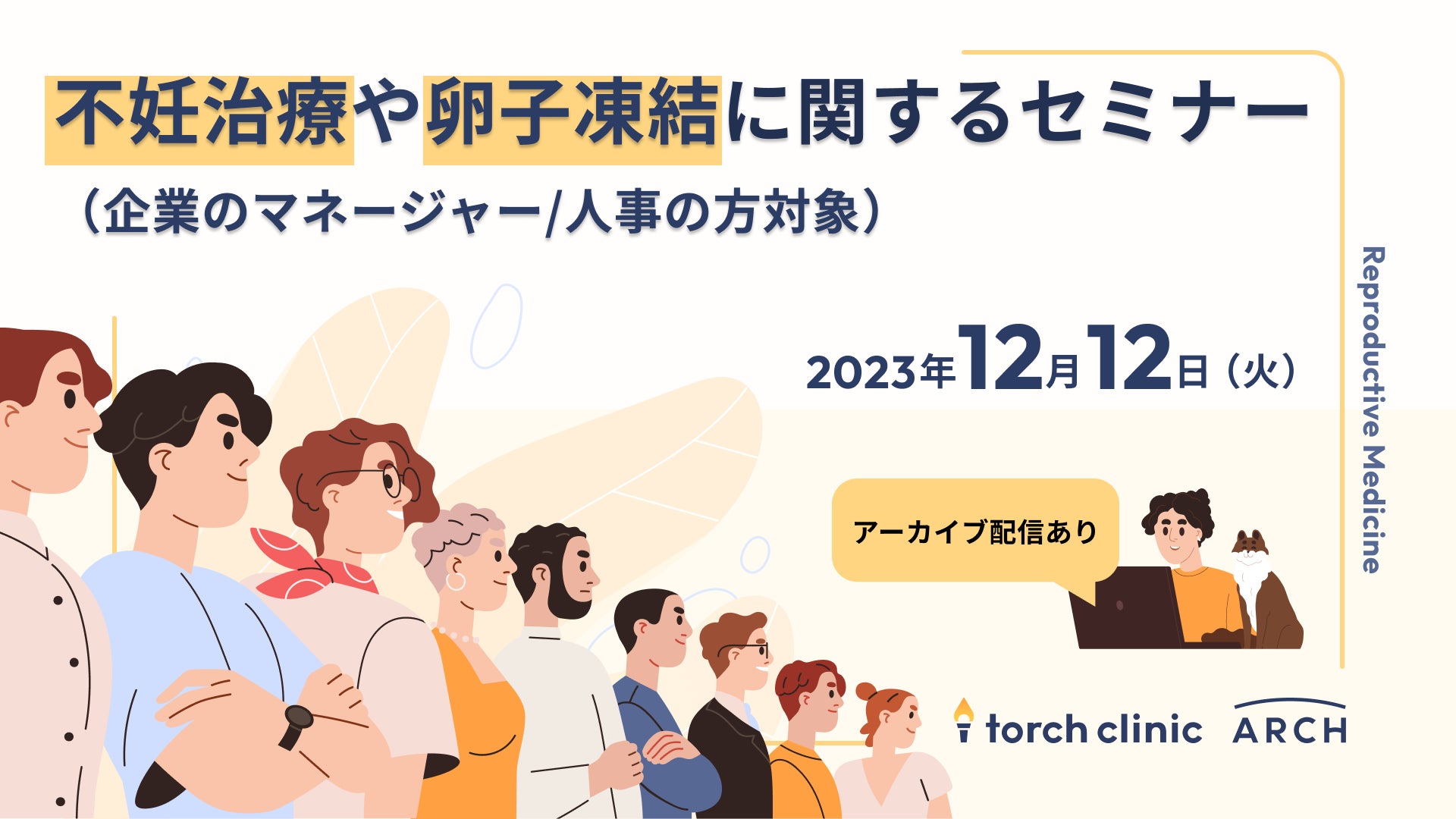 株式会社ARCH(本社:東京都港区、代表取締役CEO:中井友紀子)と、ARCHがDX支援をする医療とテクノロジーを融合した不妊治療専門クリニック 「torch clinic(トーチクリニック)」(住所:東京都渋谷区恵比寿4-3-14、院長:市山卓彦)は、2023年12月12日(火)17時より、不妊治療や卵子凍結等の生殖医療に取り組むメンバーのサポートをする立場である企業のマネージャー・人事の方向けに「不妊治療や卵子凍結に関するセミナー」をARCHが入居するシェアオフィスの「CIRCLE by ANRI」にて開催いたします。同時に、本セミナーの様子をメディアに向けてオンライン配信も行いますので、師走のご多忙の折とは存じますが、万障お繰り合わせの上、是非ご出席賜りますようお願い申し上げます。本セミナーは、トーチクリニック院長市山による生殖医療に係る勉強会(基礎知識中心)と、ARCH代表の中井を始めとする企業に所属する3名のメンバーが登壇し、ディスカッションにて不妊治療に係る企業側の取り組むべき社員への支援や制度についても語ります。