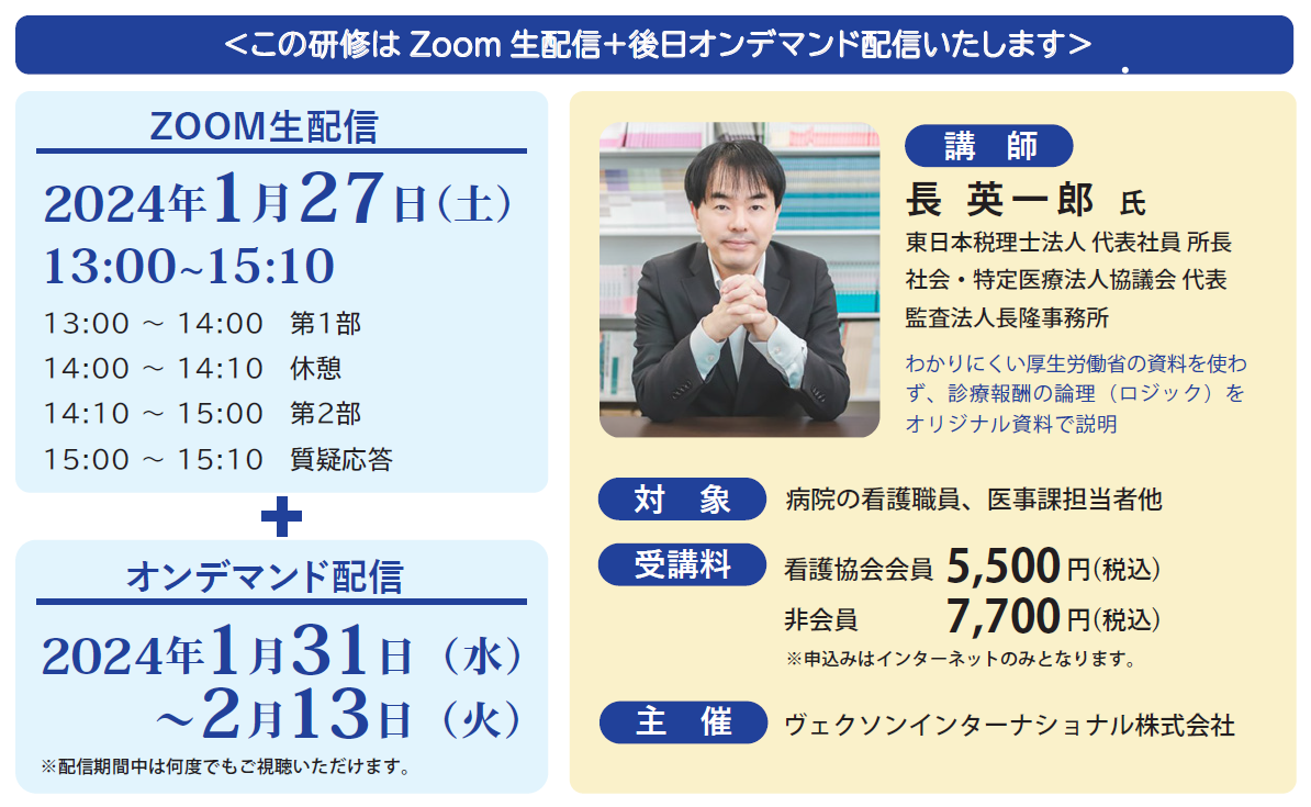 病院の看護職員の皆様、医療事務課担当の皆様には2024年の診療報酬改定について理解を深めるべく、この機会にぜひ本研修へご参加ください!
