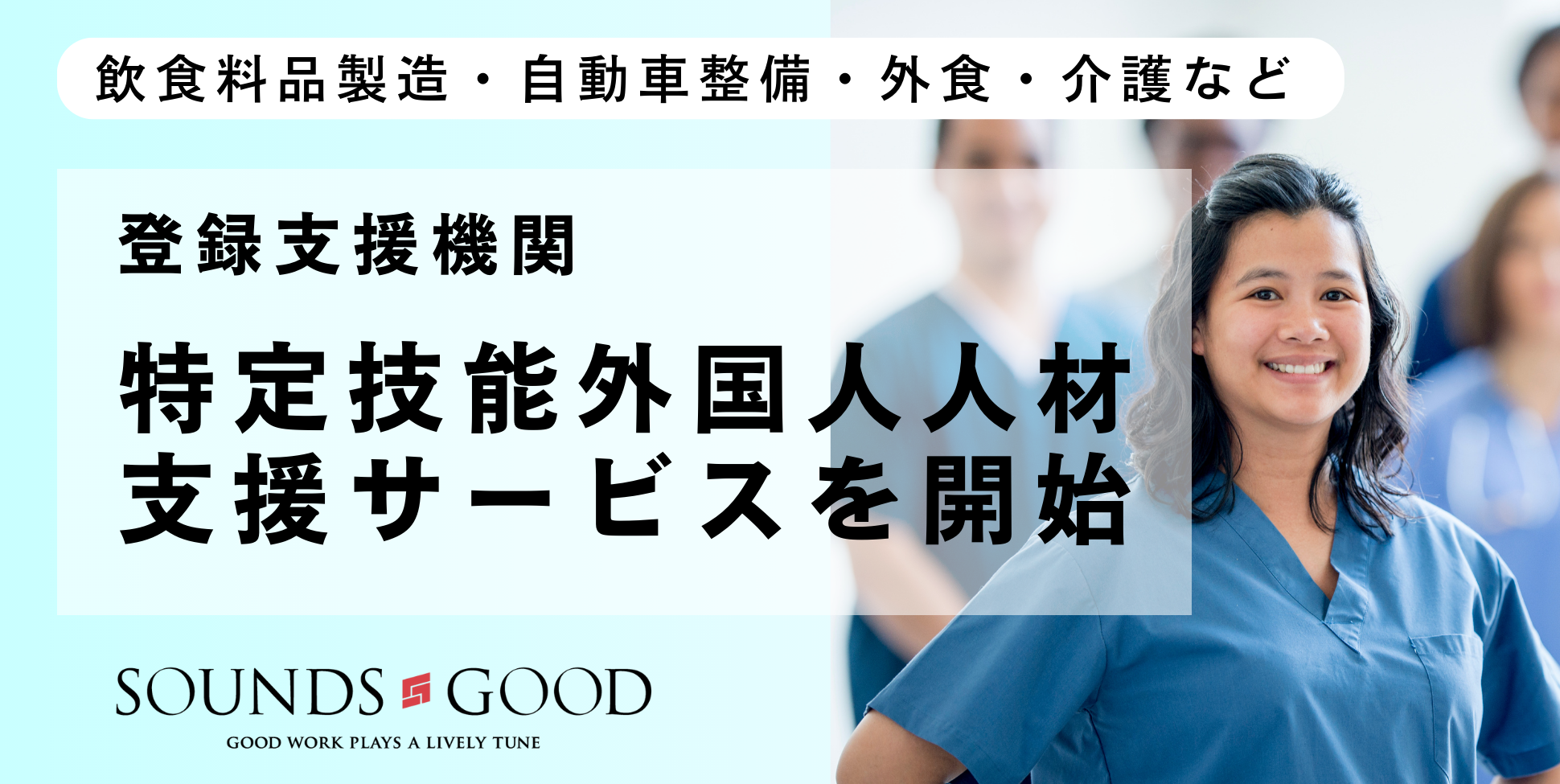 SG グループ株式会社(本社:東京都新宿区、代表:川上 真一郎)のグループ会社である株式会社サウンズグッド(本社:東京都新宿区、代表:川上 真一郎、以下当社)は、特定技能制度における「登録支援機関」として出入国在留管理庁の認可を受け、6月1日より企業向けサービスを開始することをお知らせします。当社がこれまでに人材派遣事業で培った外国人労働者支援の実績やノウハウを活かし、今後は特定技能における企業側のスムーズな受け入れおよび外国人雇用による企業発展の実現に向けた支援サービスを提供して参ります。▶https://www.sounds-good.co.jp/specifiedskills