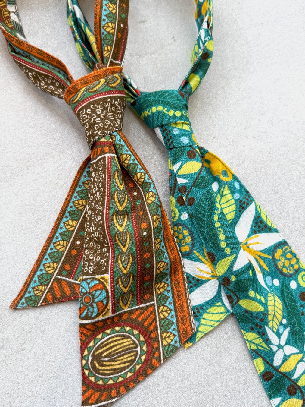 シャツは、廃棄予定のタマネギの皮から抽出した成分をベースに染め上げたOnibegie(R)シリーズを採用。ステッチが効いたデニムエプロンを合わせ「コーヒー農園」で働く方々をイメージしたスタイリングになっています。そしてスカーフは使用後の紙資源や未利用の間伐材をアップサイクルした紙糸「TSUMUGI」を使用した生地に、プリントを施して製作しました。2つのデザインともに、コーヒーや農園をイメージした異国情緒漂うオリジナルデザインです。胸元で結んでも、頭に巻いても使える2WAY仕様になっています。