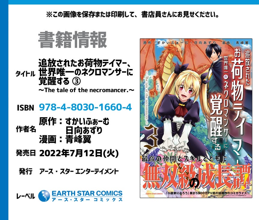 アース・スターノベルより刊行中の人気ノベル作品が原作で、現在コミック アース・スターで連載中の人気作品『追放されたお荷物テイマー、世界唯一のネクロマンサーに覚醒する ~The tale of the necromancer.~』コミックス第3巻を7月12日(火)に発売いたします。