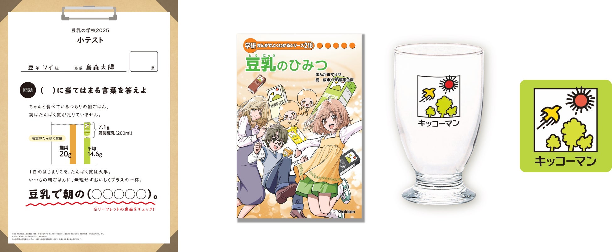 豆乳に関するクイズにお答えいただき正解すると、株式会社Gakkenと共同制作した「豆乳のひみつ」、キッコーマン豆乳オリジナルノベルティ「脚付きグラス」「ステッカー」のいずれかが当たる抽選会にご参加いただけます。