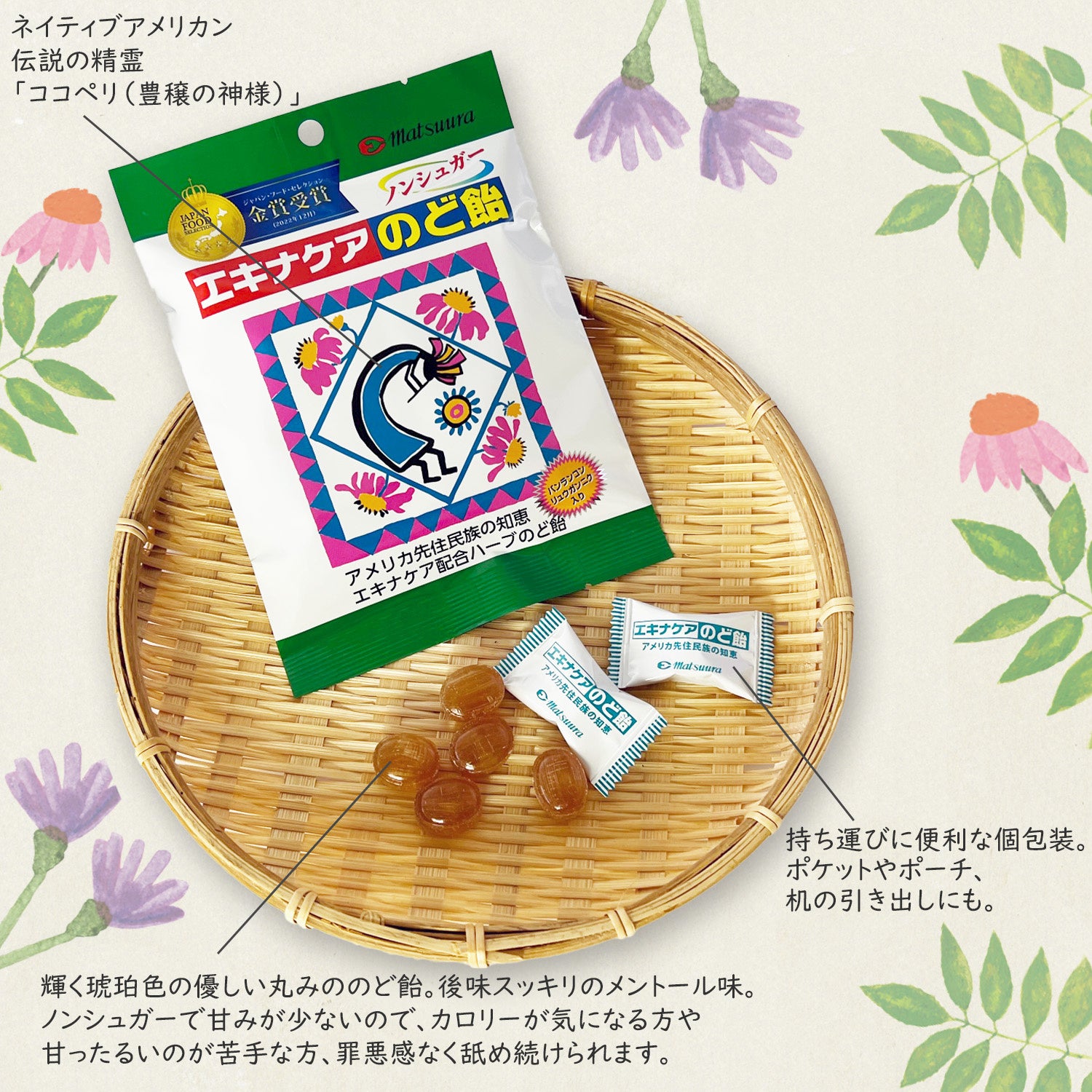 のどに優しい西洋ハーブ「エキナケア」と、古くから親しまれてきた東洋ハーブ「バンランコン」、「キキョウ」、「カンゾウ」、「リュウガンニク」の魅力をぐっと凝縮したのど飴です。