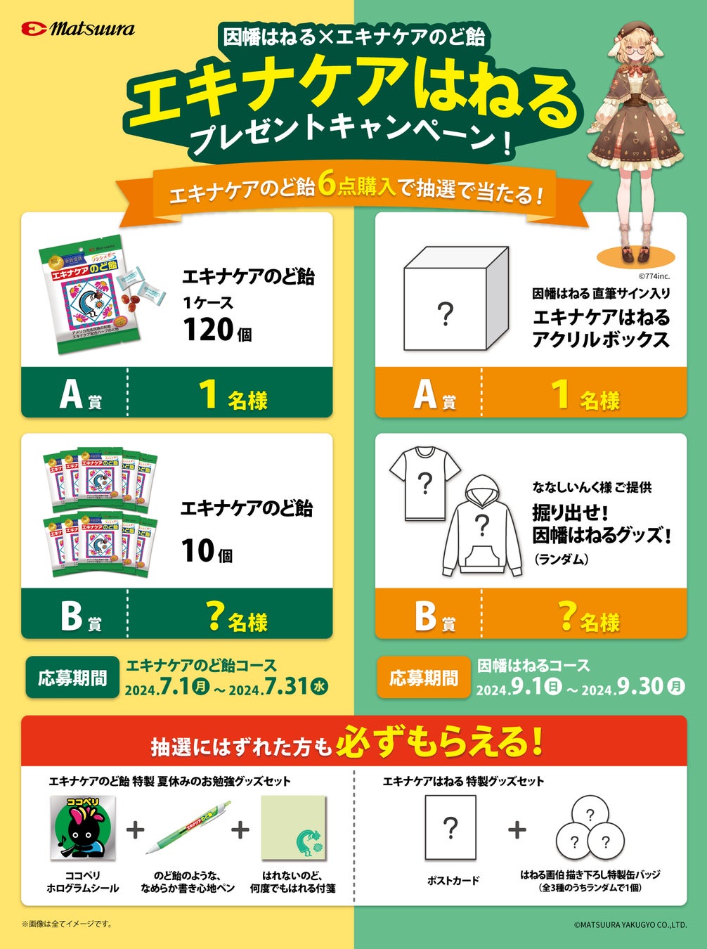 エキナケアのど飴ファンと、因幡はねるファンの皆様に喜んでいただけるよう、各コースA賞とB賞をご用意いたしました。