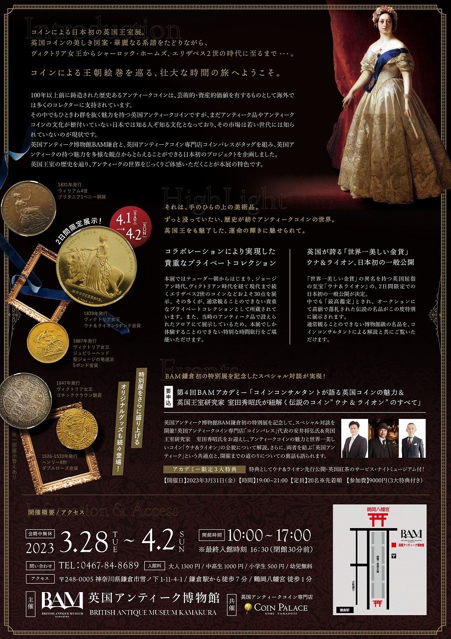 本展ではテューダー朝からはじまり、ジョージアン時代、ヴィクトリア時代 を経て現代まで続く、エリザベス2世のコインなどおよそ30点を展示 。その多くが、通常観ることのできない貴重なプライベートコレクションとして所蔵されています。また、当時のアンティーク品で設えられたフロア にて展示しているため、本展でしか体験することのできない特別な時間旅行をご堪能いただけます。BAM鎌倉とコインパレスの初コラボレーション により実現したスペシャル催事です。