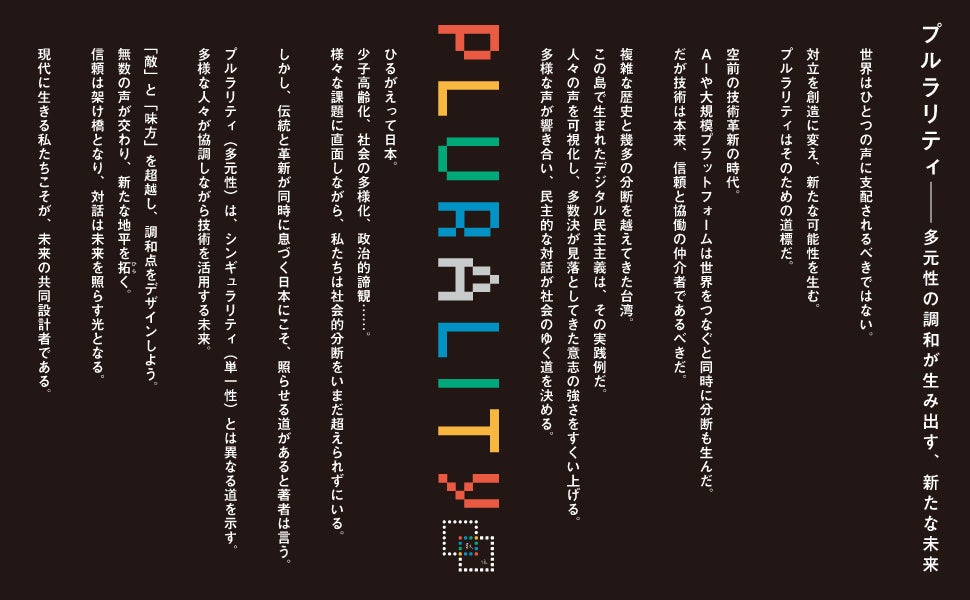 プルラリティとは「多元性」「複数性」を意味し、「特異点」「単一性」を表すシンギュラリティに対置される概念です。本書では、プルラリティを「社会的差異を超えたコラボレーションのための技術」と定義。単一の視点ではなく多様な考え方を認め、テクノロジーと民主主義の共生を目指すことで、社会的・文化的な違いを超えた相互理解と尊重を育む新たな道を、著者たちは示しています。