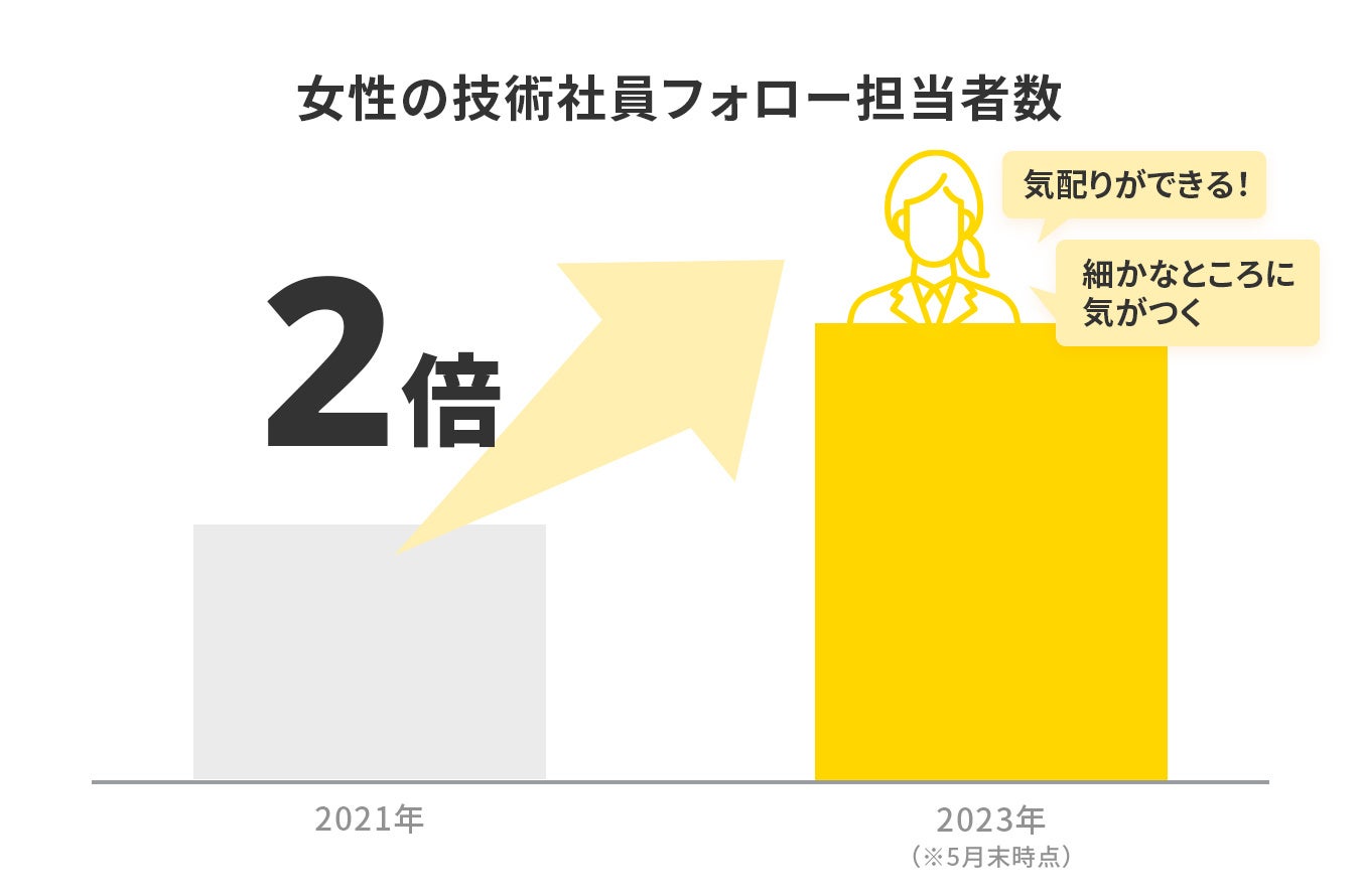 技術社員へのフォロー内容は、性差に関係なく公平に全ての技術社員に提供しています。 しかし、女性には毎月の体調変化などもあり、女性特有の不調や健康課題を抱えているケースもあります。そのため、女性技術社員が女性ならではの悩みを話しやすくなる環境を構築する取り組みの1つとして、女性技術社員に対応する女性フォロー担当者数を増やしてきました。2023年には、2021年と比較して女性のフォロー担当者数は2倍になりました。