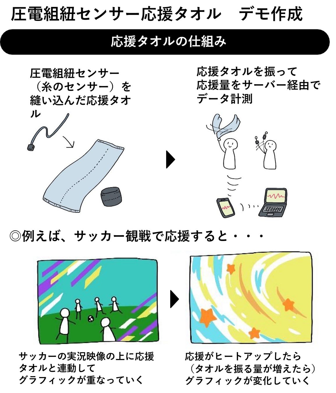 センサーを搭載したタオルを振り回してサッカーの応援力を計測!
