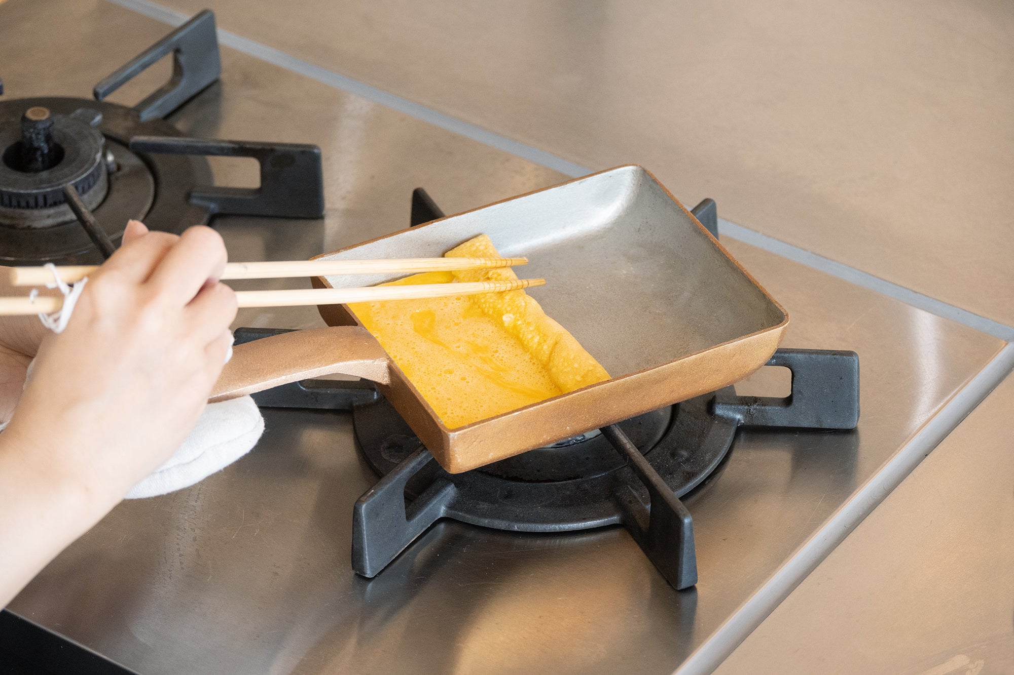 しかし、その重たさ分厚さが熱をため込み、卵を流し込んでも熱を逃すこと無く焼きムラがない美味しい、たまご焼きを作ることができるのです。