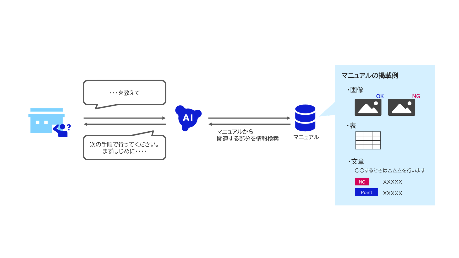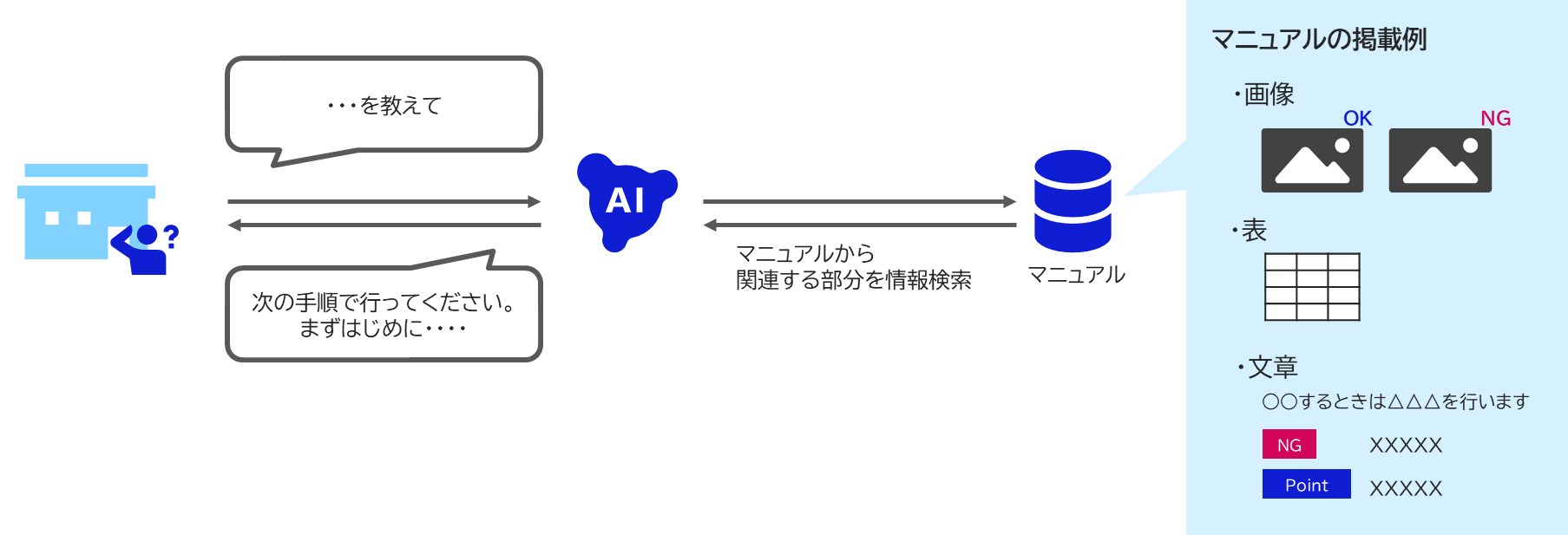 ツルハHDのマニュアルには、社内ナレッジが画像や表、文章などさまざまな形式で掲載されています。今回開発した社内ナレッジ検索システムは、テキストに限らず図や表なども理解する技術を使っており、膨大かつ複雑なマニュアルから必要な情報へ素早くたどり着ける環境を実現しています。さらにチャット形式を採用しており、従業員が文章で質問すると文章で回答する仕組みです。専門知識を必要とせず、誰でも使いやすい設計になっています。これにより、情報探索にかかる時間を短縮し、従業員の生産性向上に貢献します。2026年1月末から展開を開始し、2月末には1,000店舗以上への展開を完了しました。
