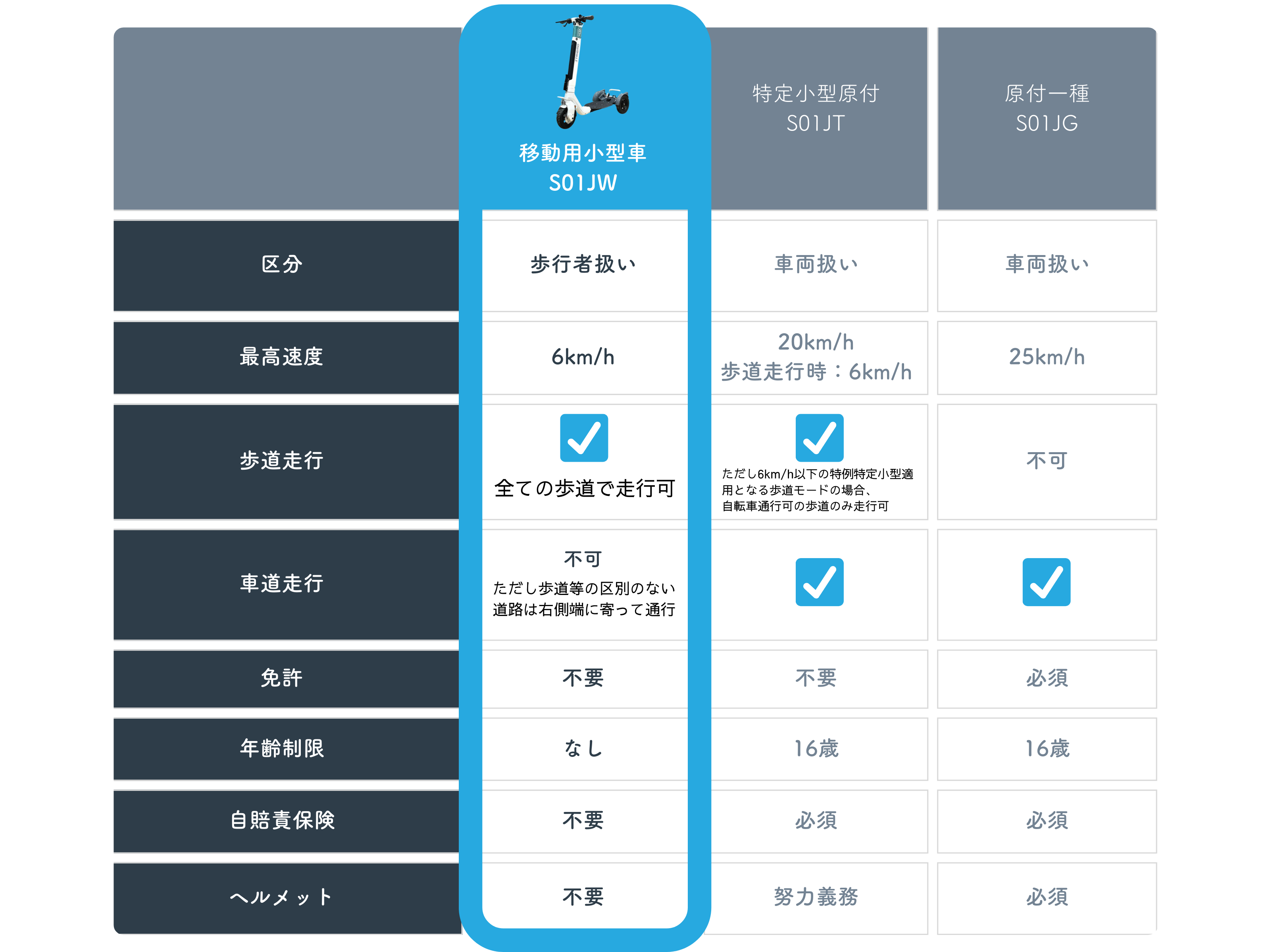 (なお、現在販売中のS01JTは特定小型原付であり、自転車通行可の歩道のみ、最高速を6km/h以下に抑え速度識別灯を点滅させることで特例的に歩道走行が可能となります。※下図参照)