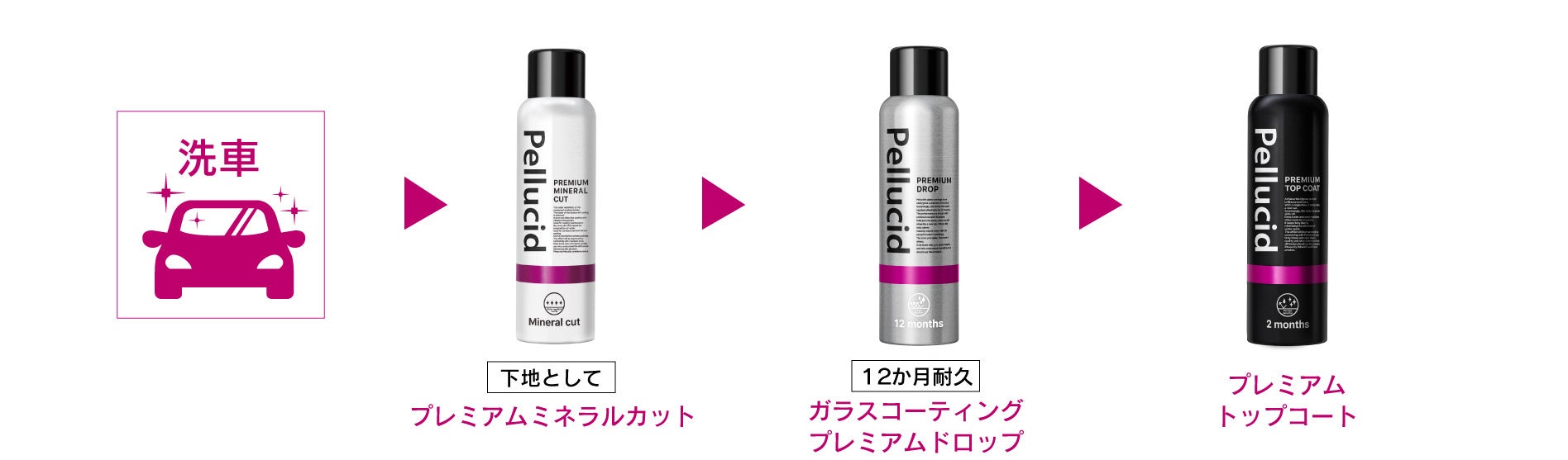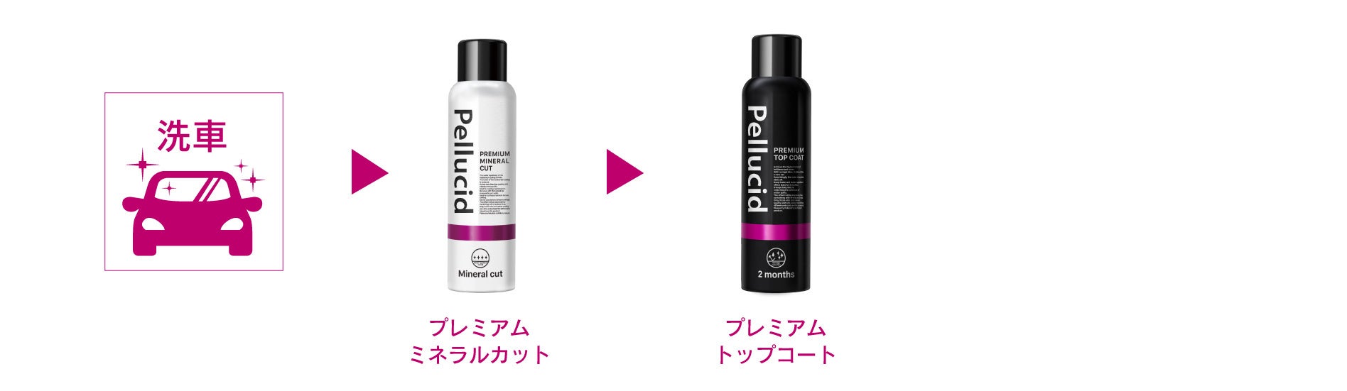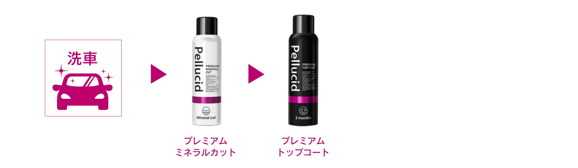 プレミアムミネラルカットは、コーティング施工車の撥水性能低下の原因となる水道水・地下水・雨によるミネラル膜をコーティングに影響なく除去することができ、新車やコーティング施工直後のような艶と光沢・撥水性能をよみがえらせることが出来ます。