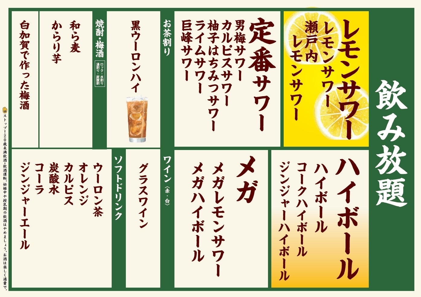 また+299円(税込328円)でアップグレード可能なプレミアム飲み放題には、「生ビール」、「デュワーズ12年ハイボール」、「名物まるよしハイボール」や「生搾りレモンサワー」などの豪華ラインナップ約20種が追加されます。