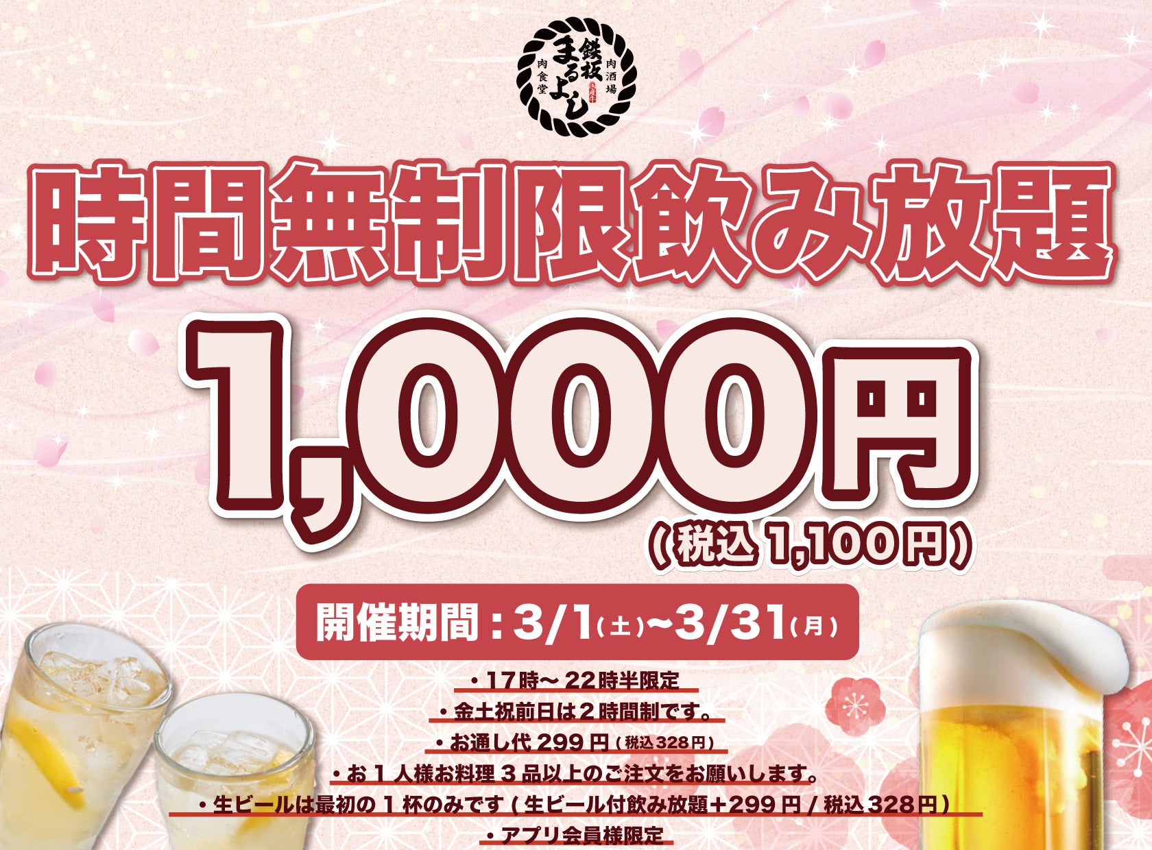 大阪市都島区を中心に大阪市内13店舗の飲食店(焼肉10店舗、居酒屋1店舗、鉄板1店舗、鰻屋1店舗)を展開する株式会社MRホールディングス(本社:大阪市都島区/代表取締役:善元正樹)が運営する鉄板肉食堂まるよし南森町店では、3月1日(土)~3月31日(月)の期間に時間無制限飲み放題1,000円(税込1,100円)イベントを実施します。