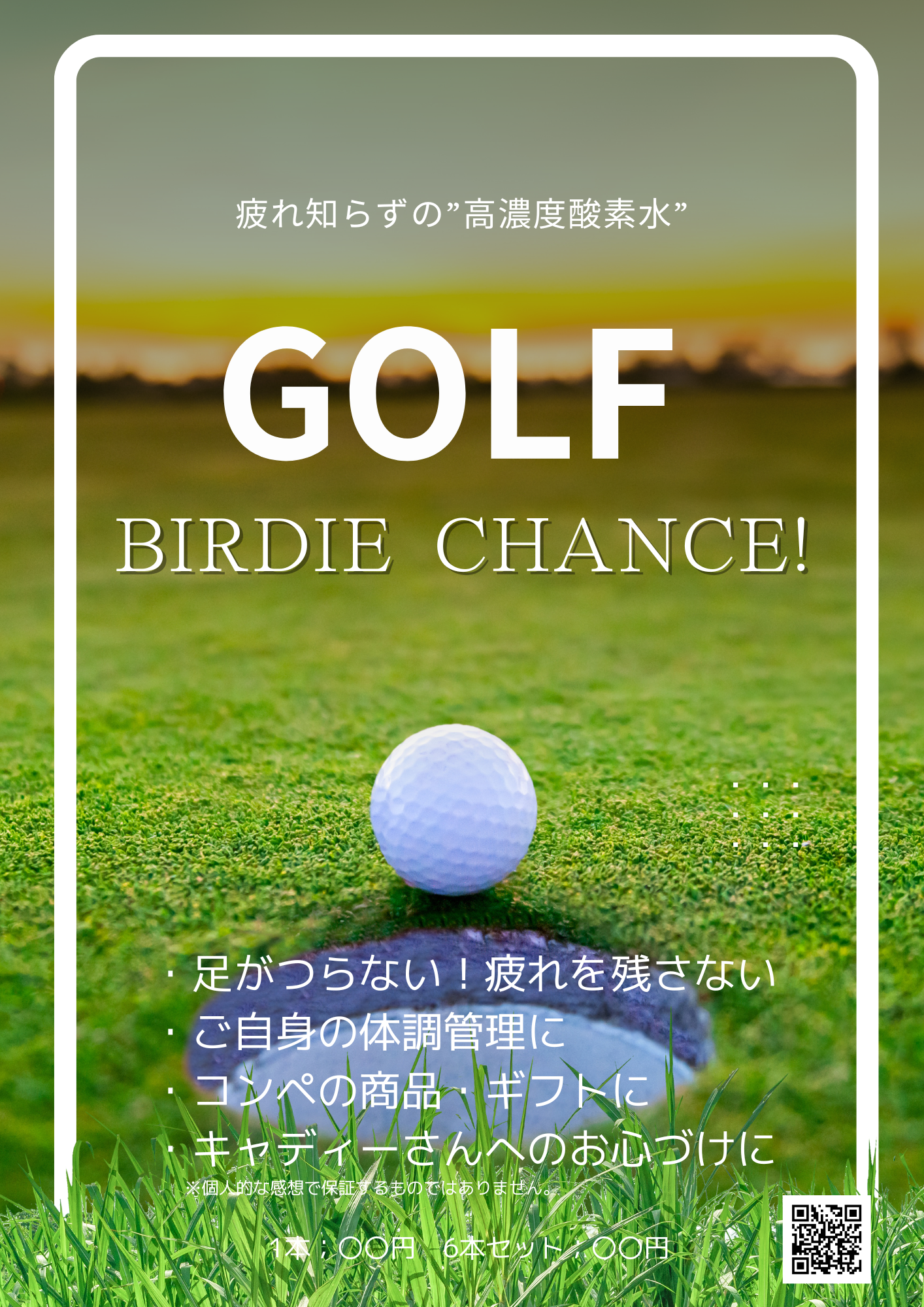 「GOLF BIRDIE CHANCE!」という製品名には、ゴルフに必要と一般的に言われる「ここぞというときのメンタル」と「18ラウンド歩き続きる体力」を支える”水”、としてだけではなく、場を盛り上げ、記憶に残るゴルフにしてもらいたいという想いを込めています」※決してバーディーを約束するものではありません。