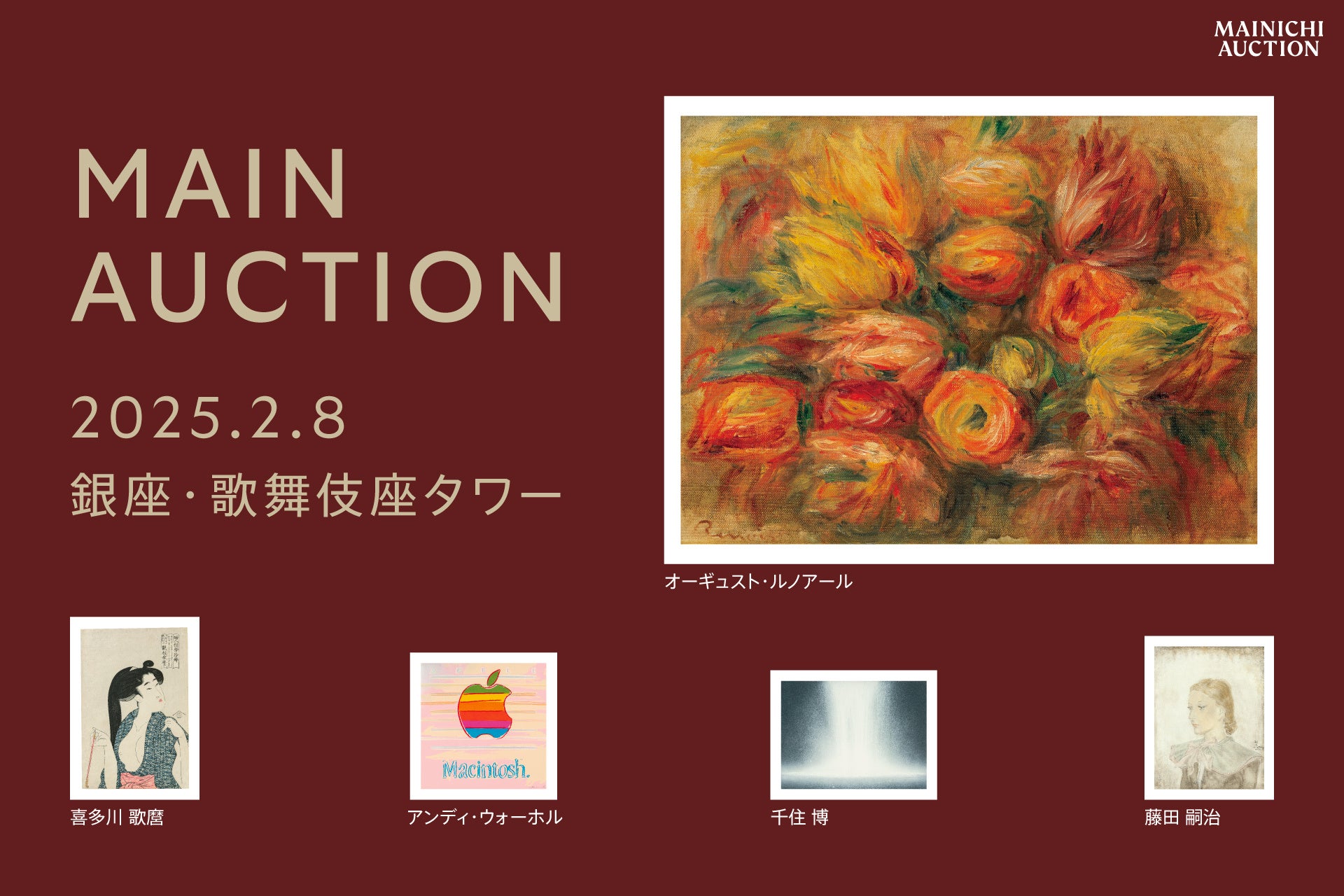 株式会社毎日オークション(本社:東京都江東区、代表取締役 社長執行役員:望月宏昭、マイナビグループ)は2025年2月8日(土)にマイナビPLACE | 歌舞伎座タワーにてメインセールオークションを開催いたします。浮世絵、日本画、洋画、現代アートといった幅広いジャンルから約300点が出品されます。