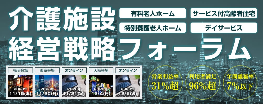 『介護施設経営者向け 経営戦略フォーラム2023』「高収益」「利用者大満足」「従業員大満足」を実現している介護施設の経営戦略を徹底解説福岡・大阪・東京会場にて11月15日より順次開催