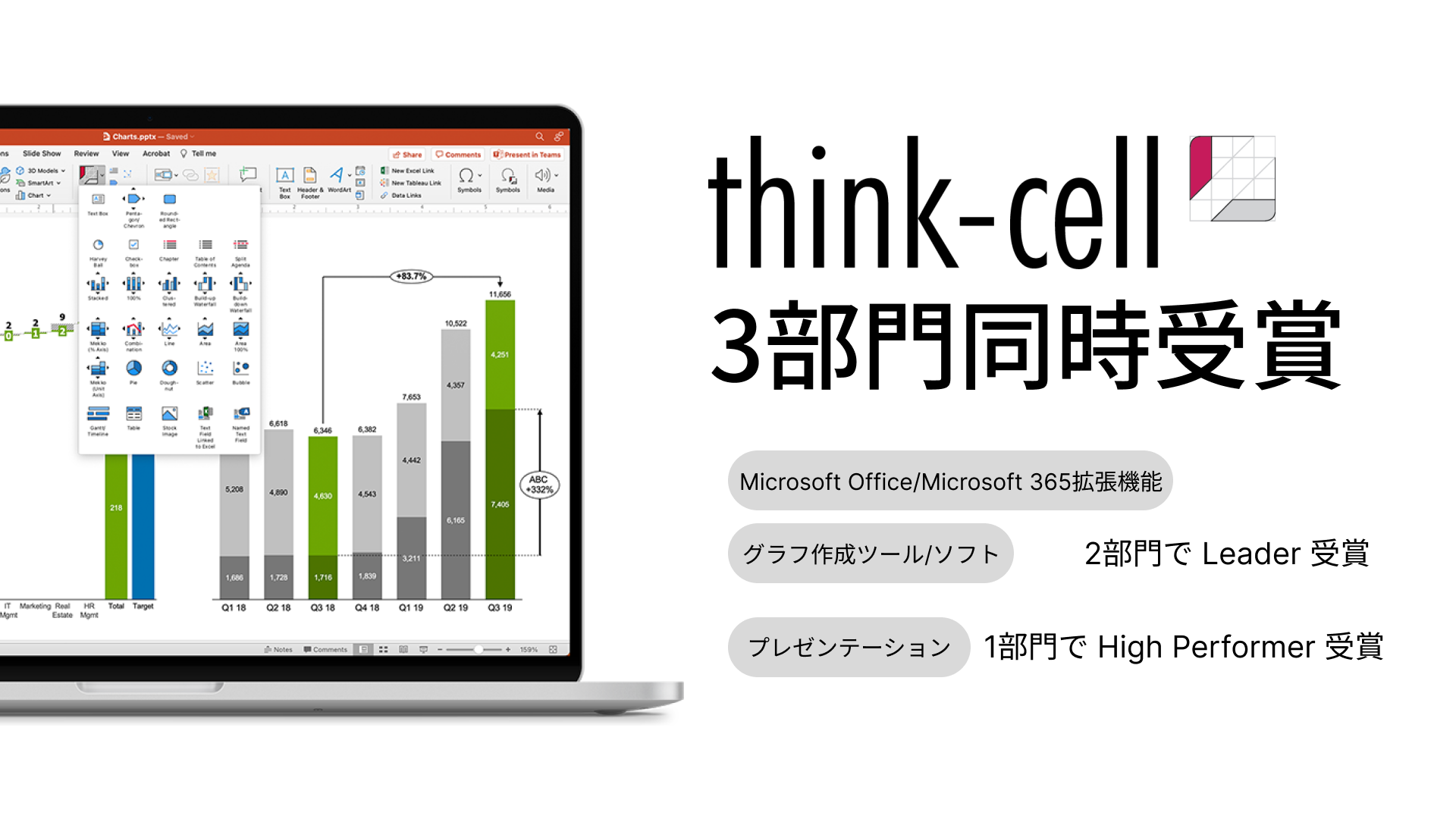 この4期連続となる受賞は、製品を実際に使用しているユーザーのレビューに基づいて評価されるものであり、弊社製品の資料作成時間の短縮による生産性向上並びにデータの可視化によるビジネスコミュニケーションの確立など、製品コンセプトと使い勝手が適切に評価されたものと感じています。すべてのレビューはこちらのリンク(https://www.itreview.jp/products/think-cell/reviews)からご覧いただけます。