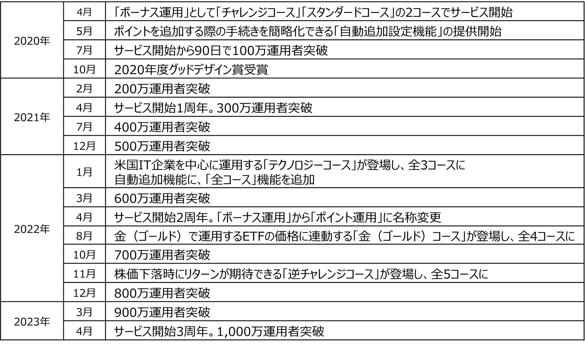 2020年4月15日のサービス提供開始から約3年での突破となり、これはポイント運用サービスを提供する主要なポイント運用サービス取扱業者で最速記録(※3)です。