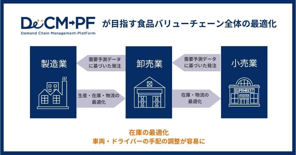 DeCM-PFは小売業・卸売業・製造業をつなげることで、食品バリューチェ―ンを最適化するプラットフォームです。現在、製造業や卸売業では、小売業や消費者が欲しい商品数を正確に把握することがむずかしく、見込みで生産・在庫計画をたてています。その結果、余分な在庫が発生したり、効率の悪い物流が生じている状況です。DeCM-PFは、小売業の実績や計画に基づいてAIが算出した需要予測データを、卸売業や製造業に連携することで食品流通の課題を解決し、バリューチェーンの最適化を目指します。