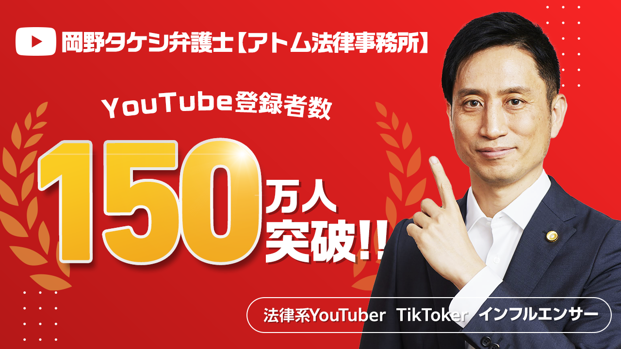 法律系YouTuber『岡野タケシ弁護士【アトム法律事務所】』のチャンネル登録者数が150万人を突破しました!