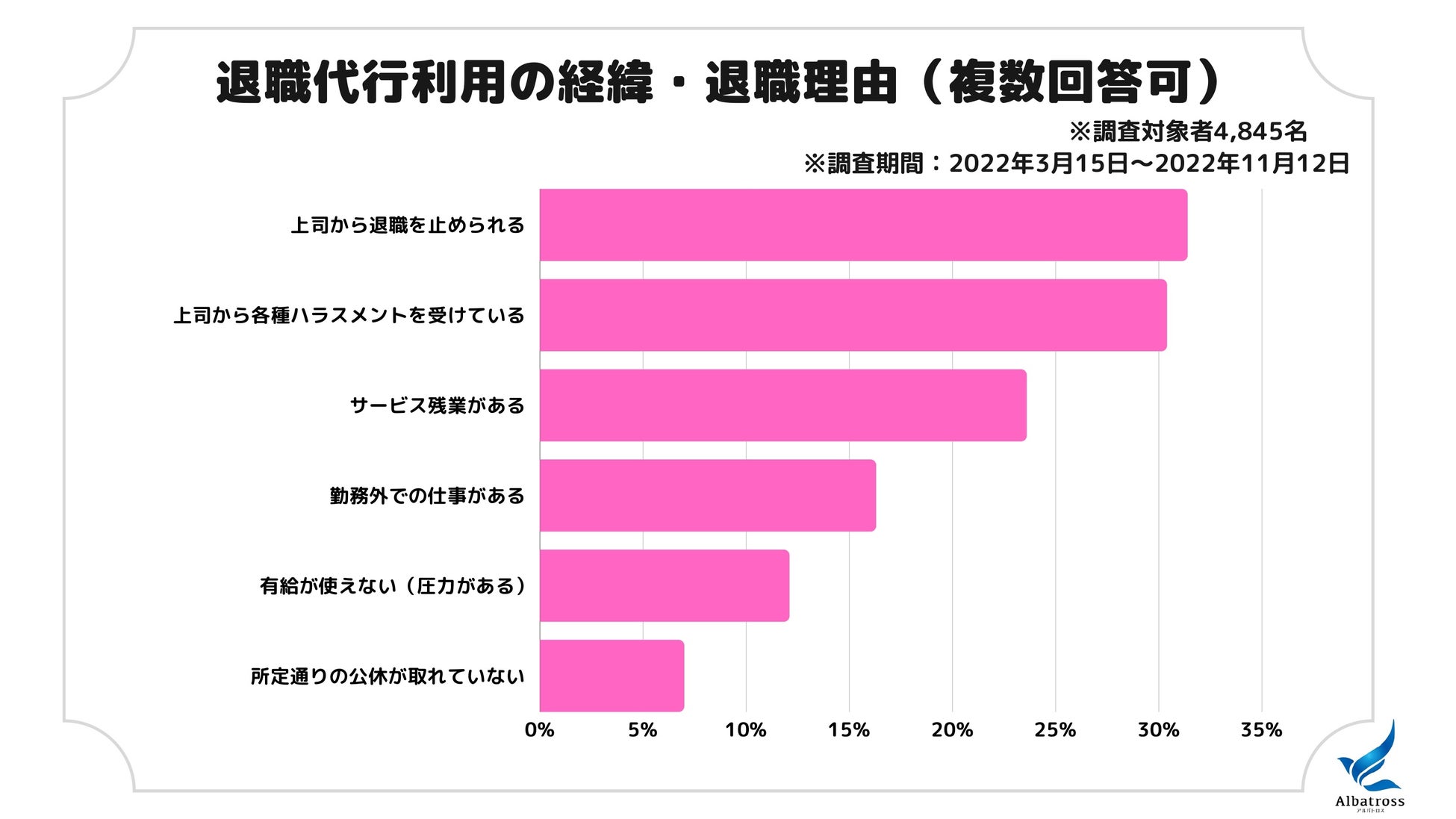 弊社事業の退職代行サービスからのデータでも、労働環境で悩まれている方は非常に多いです。