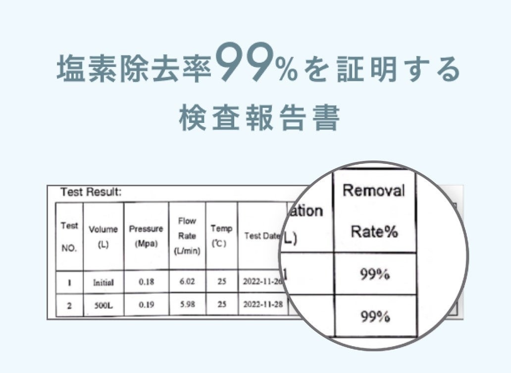 一般的に塩素除去フィルターには亜硫酸カルシウムが使用されることが多いですが、Noendは素材までこだわり自然素材の活性炭を採用しています。活性炭は亜硫酸カルシウムフィルターと比較し、10倍の耐久力と3倍の塩素除去率を発揮。(自社調べ)
