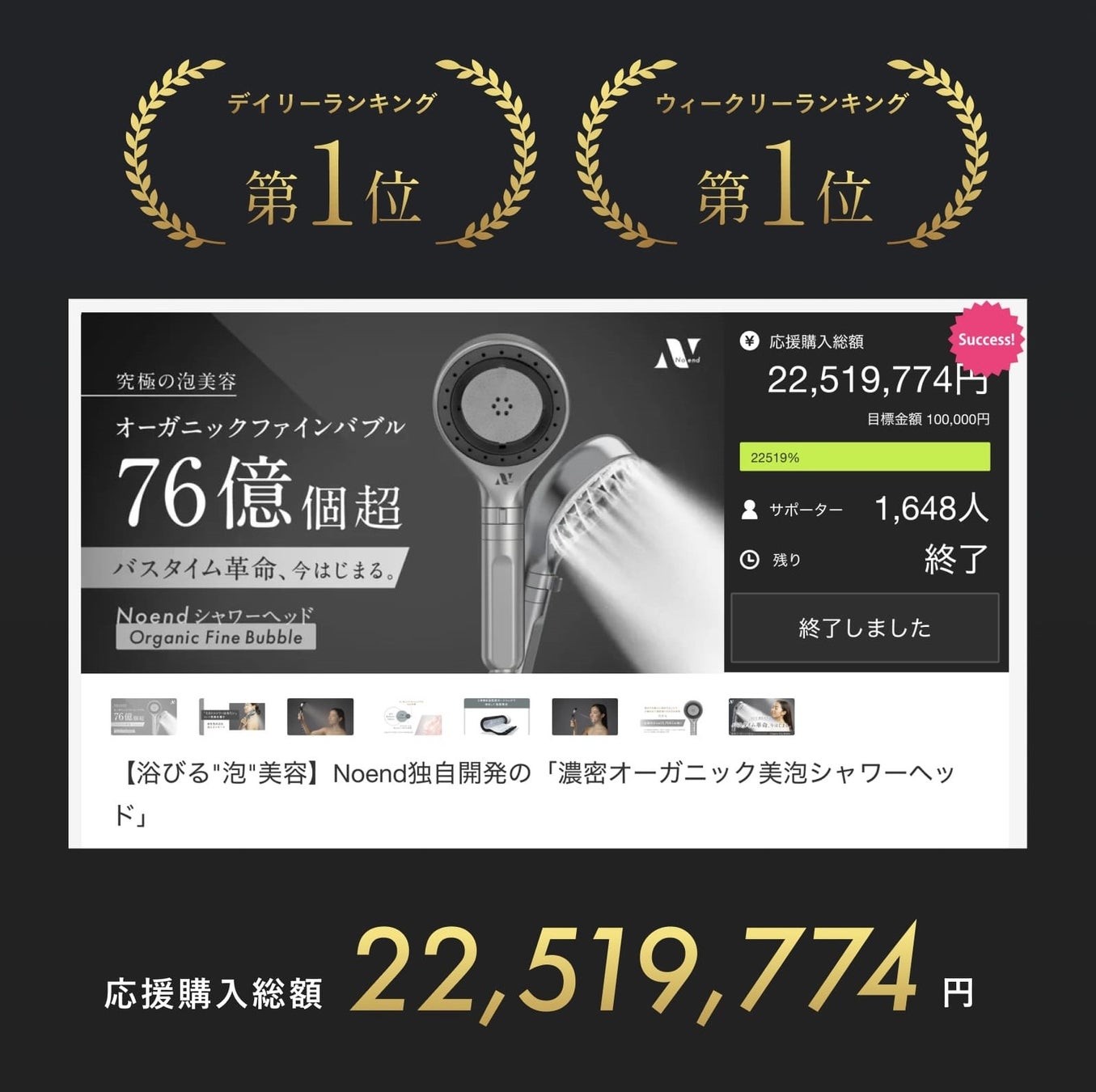 5月11日(土)よりクラウドファンディングMakuakeにて先行販売を開始した『Noend オーガニックファインバブルシャワーヘッド』の増圧バージョンは、Makuake開始からわずか3日間で応援購入金額2,500万円を達成し、デイリーランキング1位を獲得するなど好調な滑り出しとなりました。