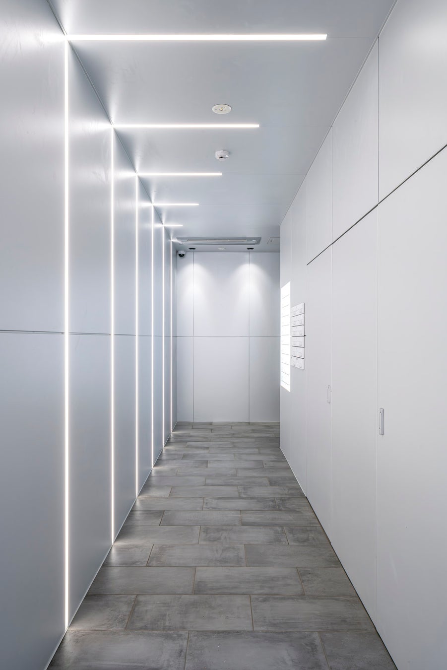 本物件のエントランスのライティングは千本鳥居をイメージしています。伝統的な千本鳥居を現代風にシンプルでシックなデザインにすることで洗礼されたモダンなオフィスビルとの調和を生みだします。