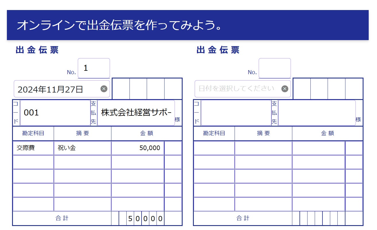 出金伝票を作成する際は、テンプレートに沿って日時やその内容、金額などを入力するだけです。