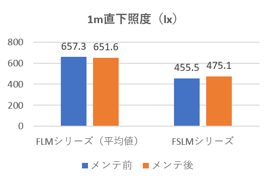 【FLMシリーズ】 1m直下照度(lx):657.3(メンテ前)→651.6(メンテ後) 変化率-0.81%