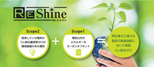 「REShine」を販売するアップルツリーの東北工場では、電力を含めるすべてのエネルギーをカーボンオフセットにいたしました。
