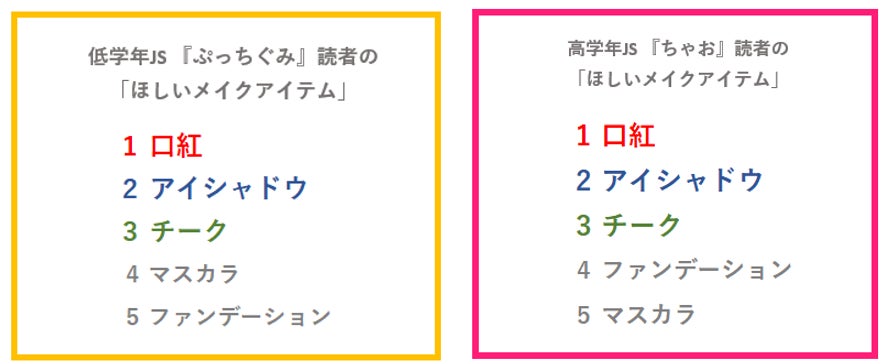 高学年JS『ちゃお』読者には、「ほしい化粧品」の中でもアイテム別に具体的なブランドを調査。