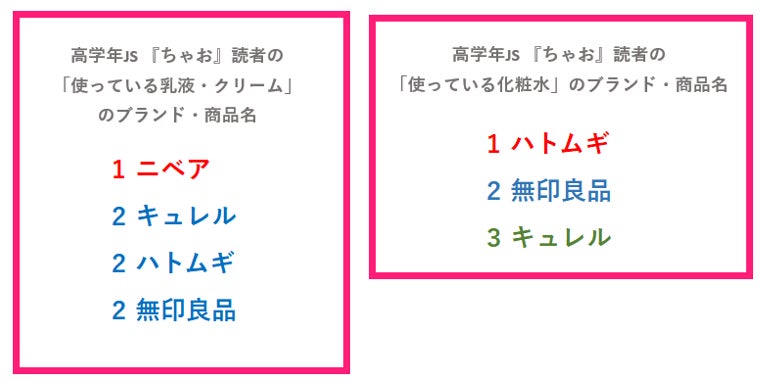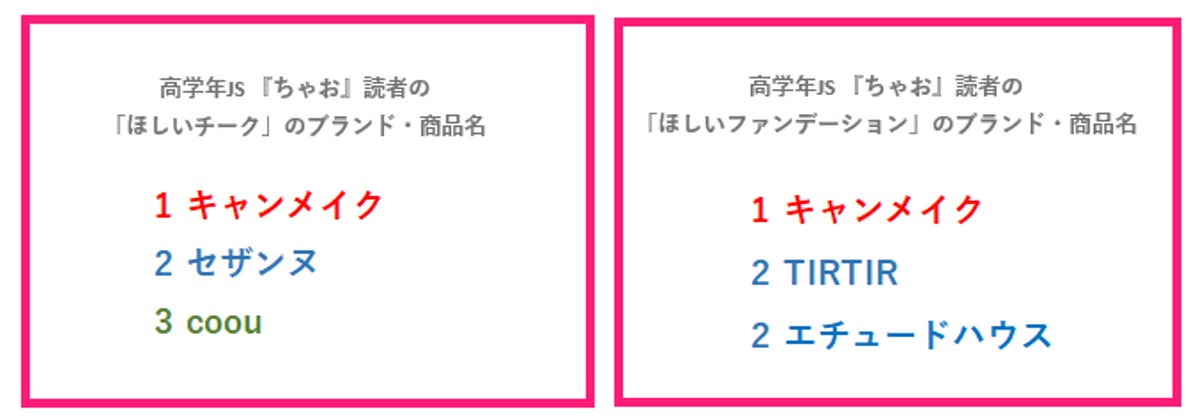 今回は、『ぷっちぐみ』2024年2・3月と『ちゃお』2024年2月号にて掲載・収集した、「ビューティー事情」に関する調査結果を、イマドキJSの最新トレンドとして発表いたします。 メイク編とスキンケア編それぞれのカテゴリで実際に使用しているアイテムや、人気のブランドなどが明らかになりました。