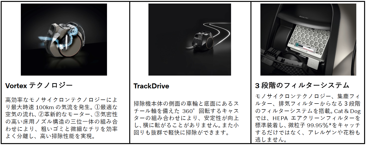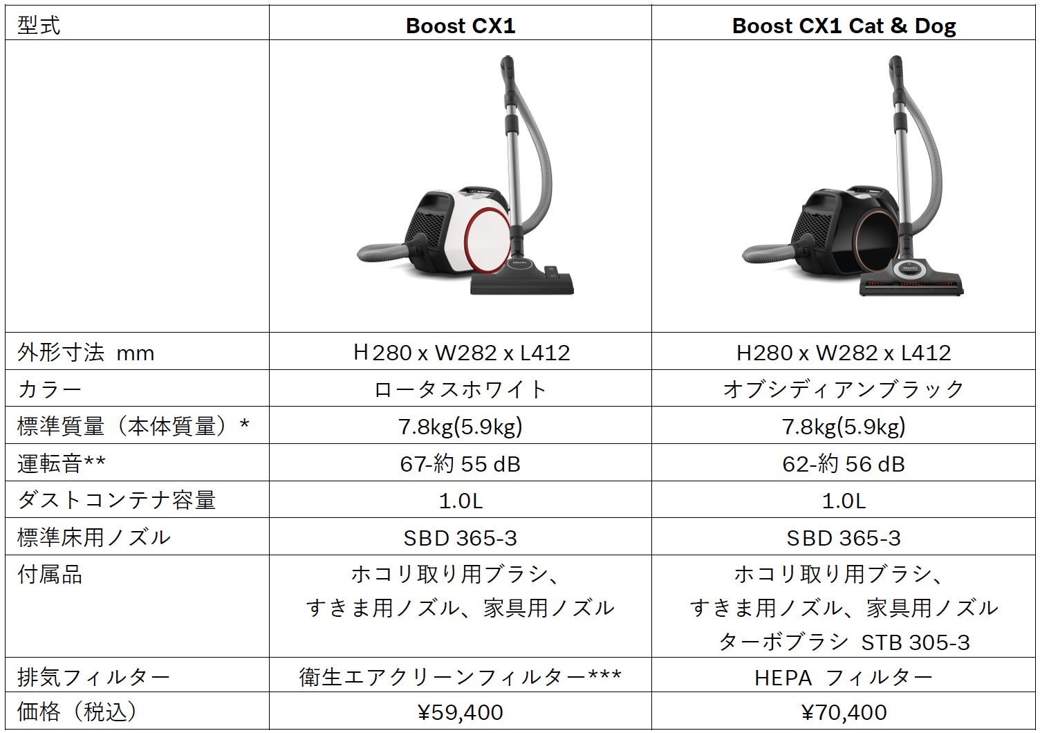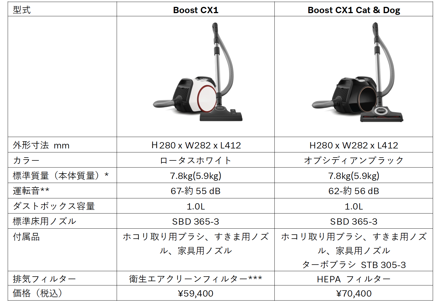 サイクロン式キャニスター掃除機「Boost CX1」シリーズからは、エントリーモデル「Boost CX1」(ロータスホワイト)と高性能HEPAフィルターを搭載した「Boost CX1 Cat & Dog」(オブシディアンブラック)の2機種を発売します。