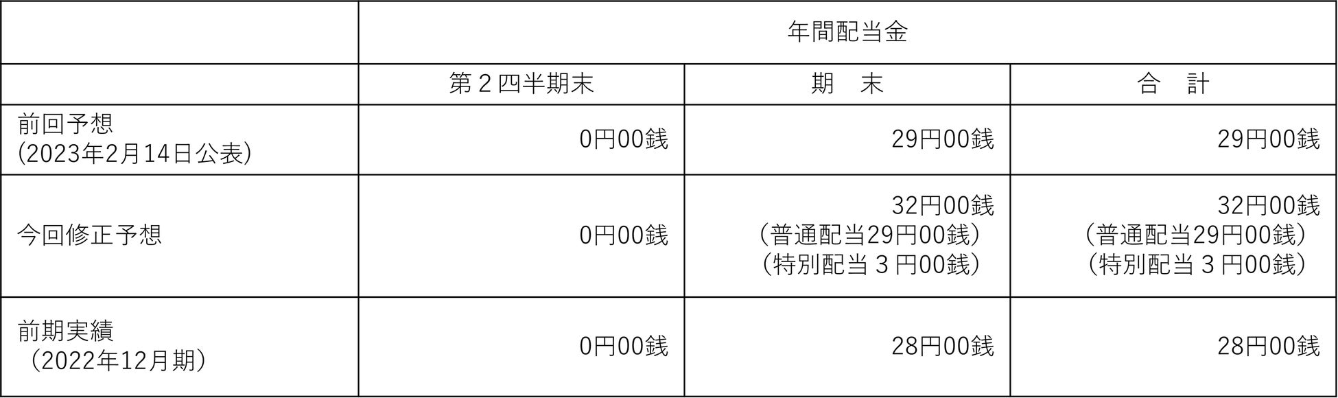 2023年12月期につきましては、長期・継続的な増配をめざす株主還元の基本方針に基づき、期末配当を29円としておりました。これに加え、株主優待制度の廃止に伴い、2023年12月31日を基準日とする当社株主名簿に記載されたすべての株主様に1株当たり3円の特別配当を実施することといたしました。