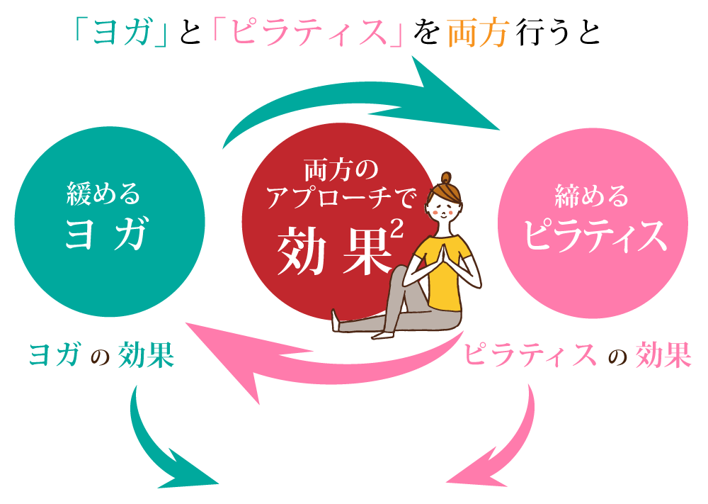 ピラティスで正しい身体の使い方を学ぶことによって、ヨガのポーズがとりやすくなり、身体の可動範囲が広がります。このためヨガで安定したポーズをとることができ、よりポーズの効果や、リラックス効果、ストレッチ効果が深まり、ウエストのくびれやヒップアップ、生理不順の改善、産後の弛んだ身体の引き締め等が期待できます。