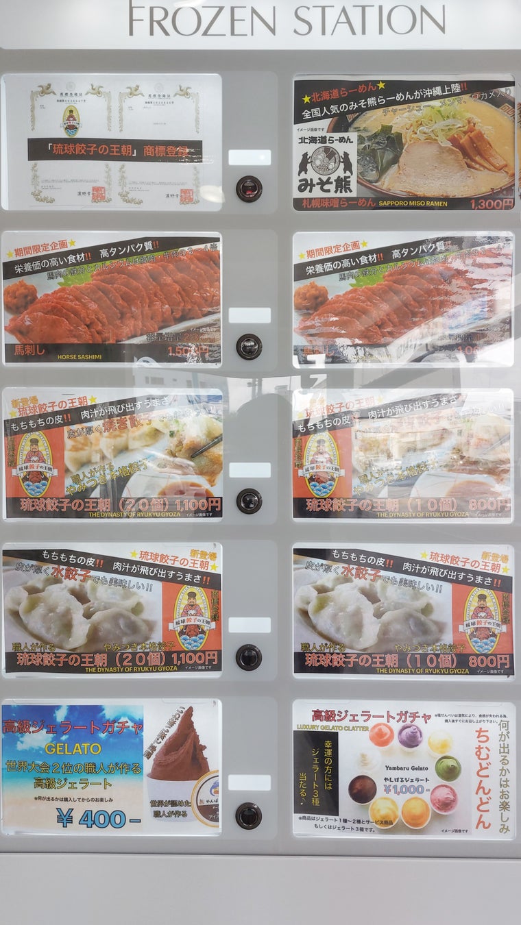 同社が展開する冷凍自販機には、グルメフードの餃子や馬刺しなど、北海道味噌ラーメン、ジェラートガチャなどがラインナップされています。